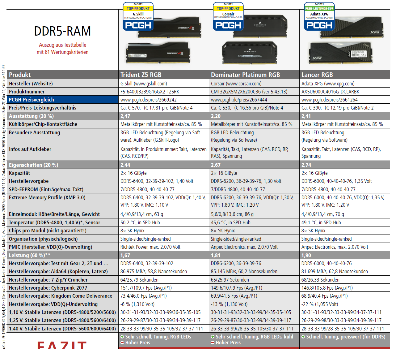Mein RAM ohne RBG ist auch auf der Kompatibilitätsliste des Mainboard bei Asus. Im Anhang der Test von PCGH dazu. Bei DDR5 sind momentan die SK Hynix die beste Wahl für RAM-OC/Tuning