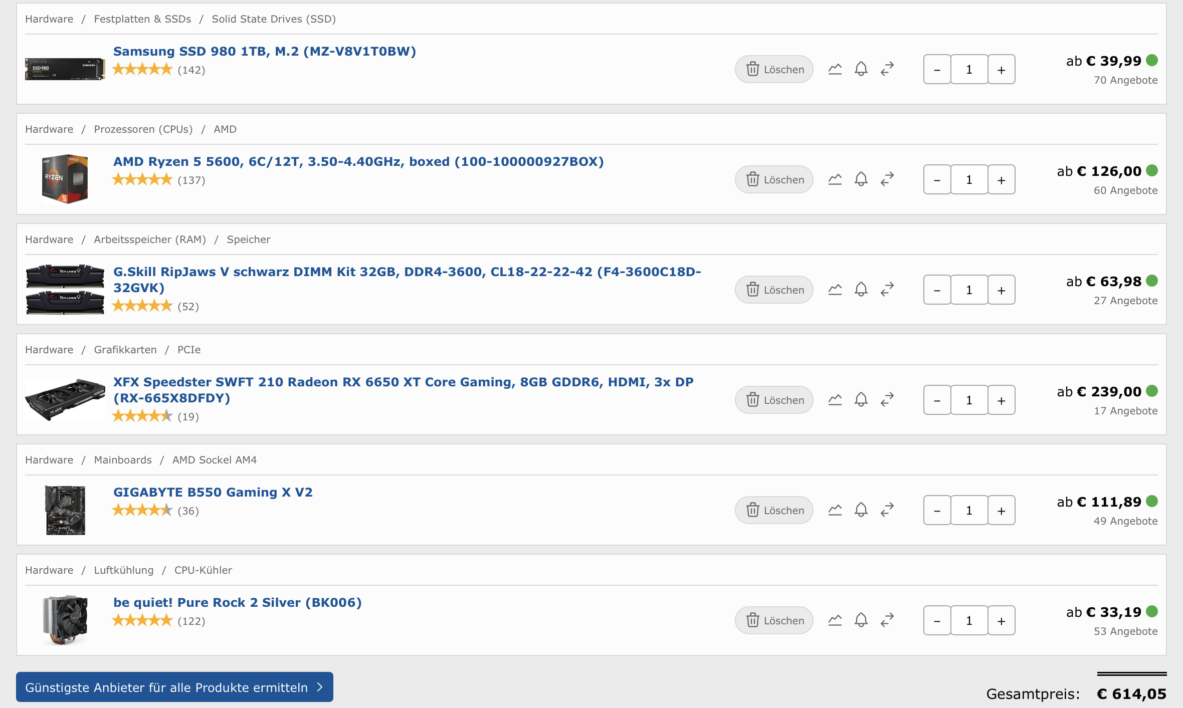 Weiterhin würde ich mich den Vorschlägen aus #6 anschließen, zusätzlich würde ich noch das MB gegen das MSI B550-A Pro tauschen, aktuell etwas günstiger, bessere VRMs (für den 5600 egal), einen Passivkühler auf dem ersten m.2 Slot und rückseitiges USB-C.
