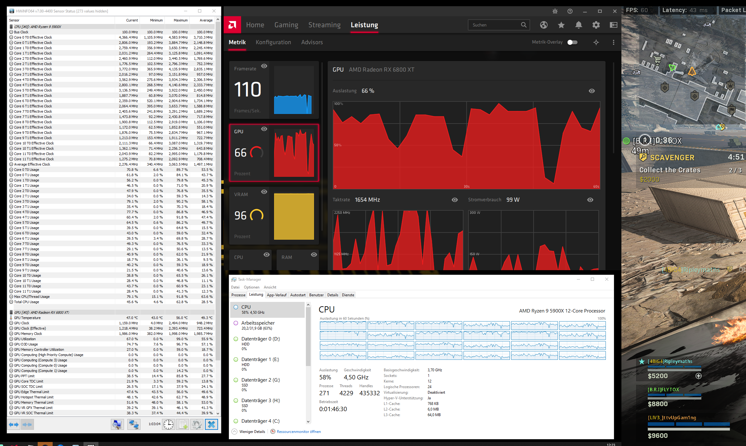 Hab den Rechner "Neu" seit anfang des Jahres. Kann damit wenn ich nicht Streame alles ohne Probleme und Beschwerden super Spielen - Warzone, CS:GO, LoL, Valorant, Apex, BDO.. Aber sobald ich anfange zu Streamen (über Streamlabs) ruckelt es ingame extrem und es treten ebenfalls krasse FPS drops auf. Bei Warzone habe ich statt durchschnittlich 230 FPS nur noch 120-130 FPS dieser springt willkürlich dann zwischen 80 und 140-160 hin und her. Dies betrifft auch alle anderen Games. Die Ruckler sind wirklich konstant und ruchgehen da so das es nicht spielbar ist. Der Stream selbst läuft ohne Probleme und auch wenn ich meine Streams schaue kommen die Lags und die Ruckler dort nicht vor...Alles ganz merkwürdig... CPU/GPU Auslastung ist auf den Bildern hier gut zu sehen: