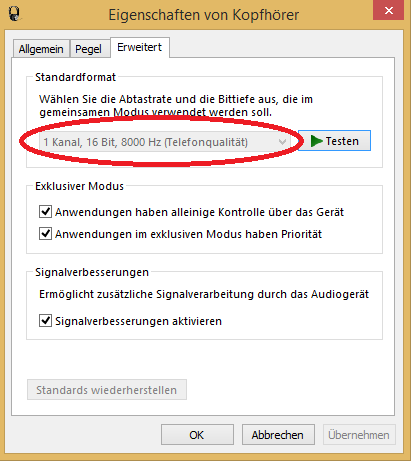 So, habe ich gemacht, leider keine Veränderung. Beim Kopfhörer ist leider immer noch nichts anderes auswählbar als 8000hz