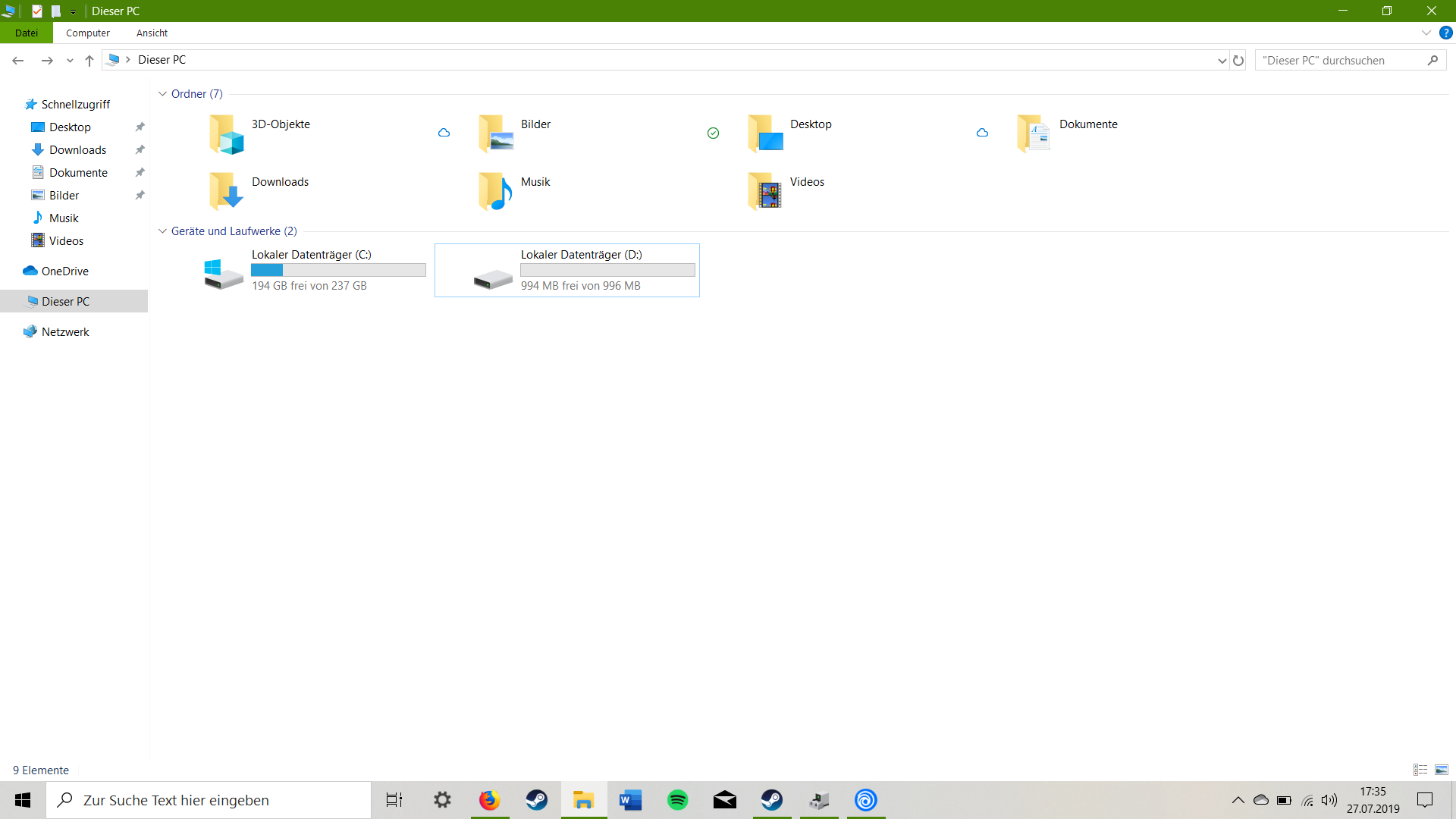 Soweit so gut, alles funktioniert wunderbar. Jetzt wollte ich noch ein Spiel installieren, aber nicht auf der SSD sonder auf der 1TB Platte. Da hab ich dann gemerkt, dass das zweite angezeigte Laufwerk wohl nicht die 1TB Platte sein kann, weil da nur 994 von 996MB frei sind. Beim schnellen Drüberschauen hab ich gedacht 994 GB, alles gut.