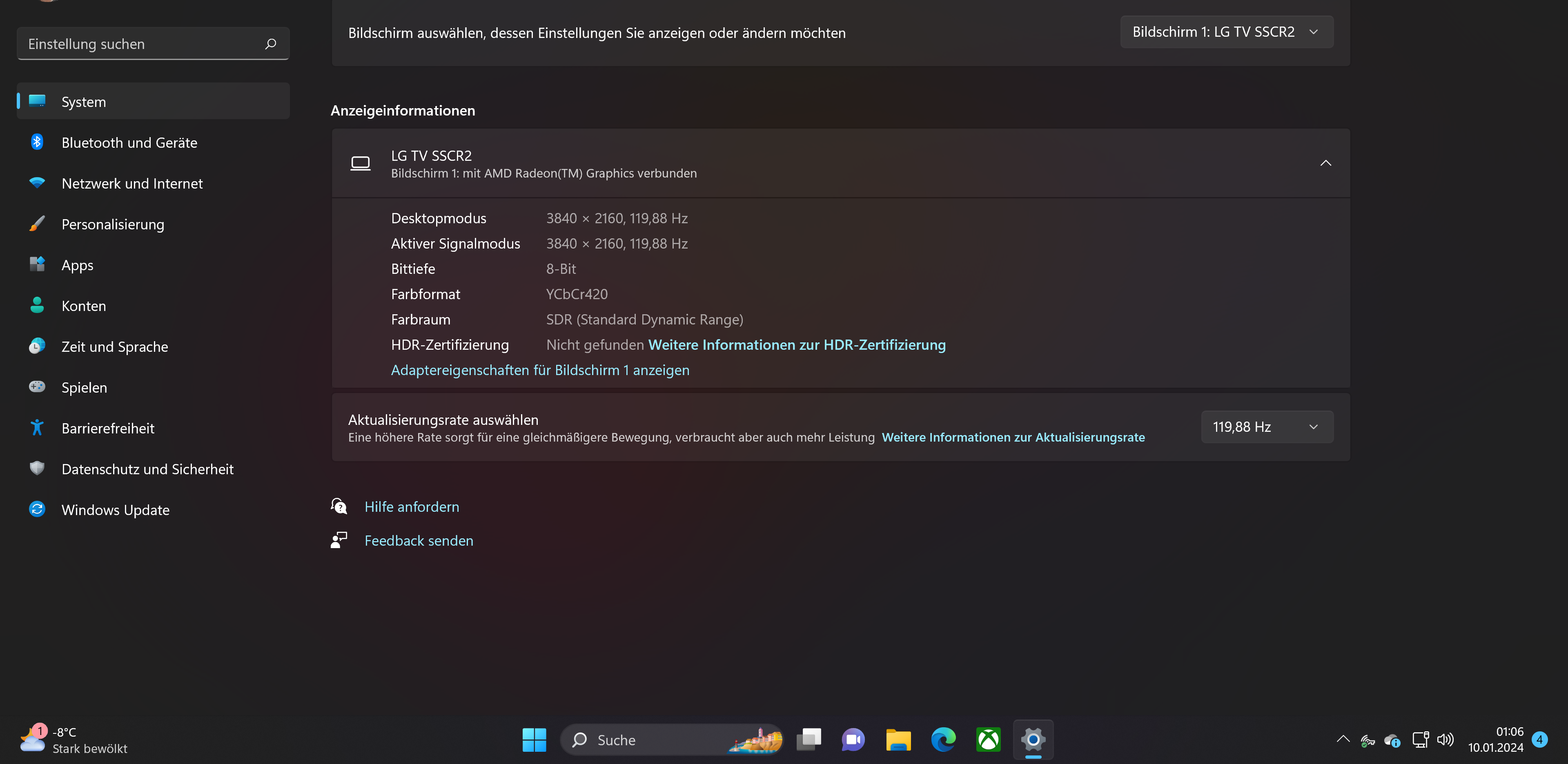 PS: An meinem vorherigen 100/120hz Sony TV lief der PC mit 119,88hz 8bit YbCbr 4:4:4