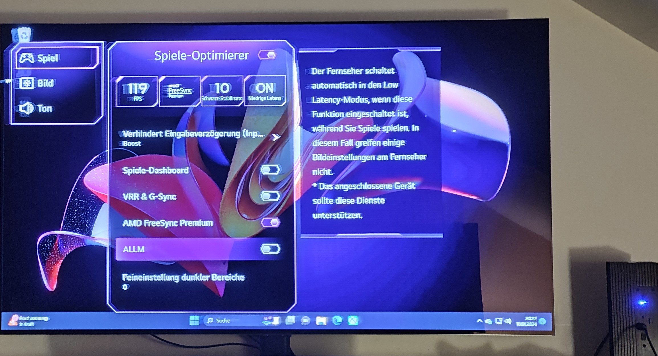 Ich habe zu Weihnachten den LG 55" Oled Evo C37LA geschenkt bekommen und ich habe mein in einen Desktop umgebautes AMD Ryzen 5500U System zum streamen an den TV angeschlossen. Der TV steht auf AMD Freesync und die Radeon Software erkennt den TV als AMD Adaptive Sync. Leider kann ich nur 60hz einstellen. Die Anzeigeeinstellungen in Windows 11 zeigen zwar auch 100hz und 120hz an, aber der TV zeigt bei Aktivierung 100 oder 120hz "Kein Signal" an und läuft derzeit auf 60hz.