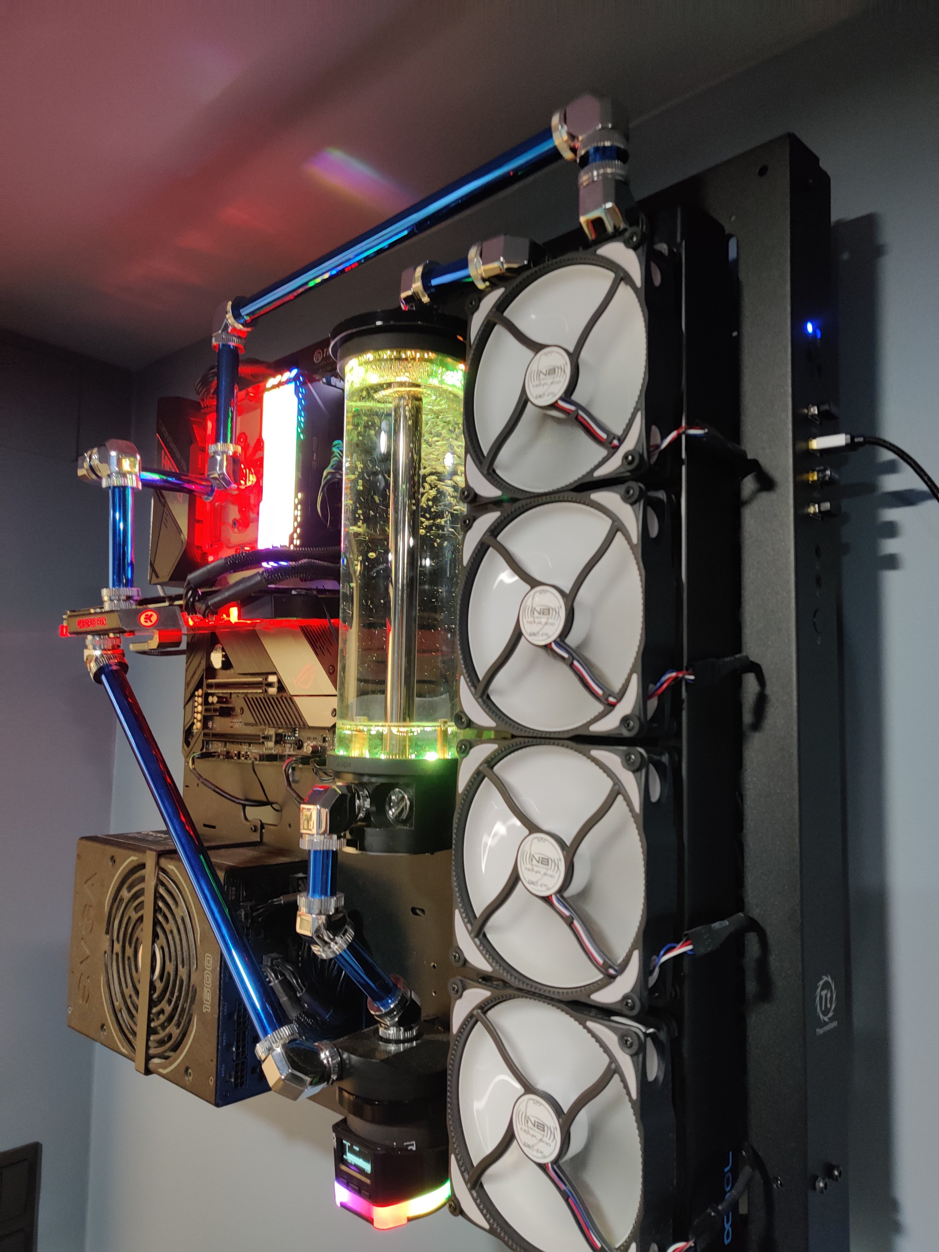 Da sich die Platzverhältnisse so ergeben haben, und besonders aus optischen Gründen, bin ich jetzt stark am überlegen meinen Radiator vertikal aufzustellen mit insgesamt 8x 120mm FANS (je 4x auf einer Seite) und einen zweiten Heatkiller 200 mit einer d5 auf der gegenüber liegenden Seite des Radiators zu montieren. (Fittings und Tubes hätte ich auch noch vorrätig).