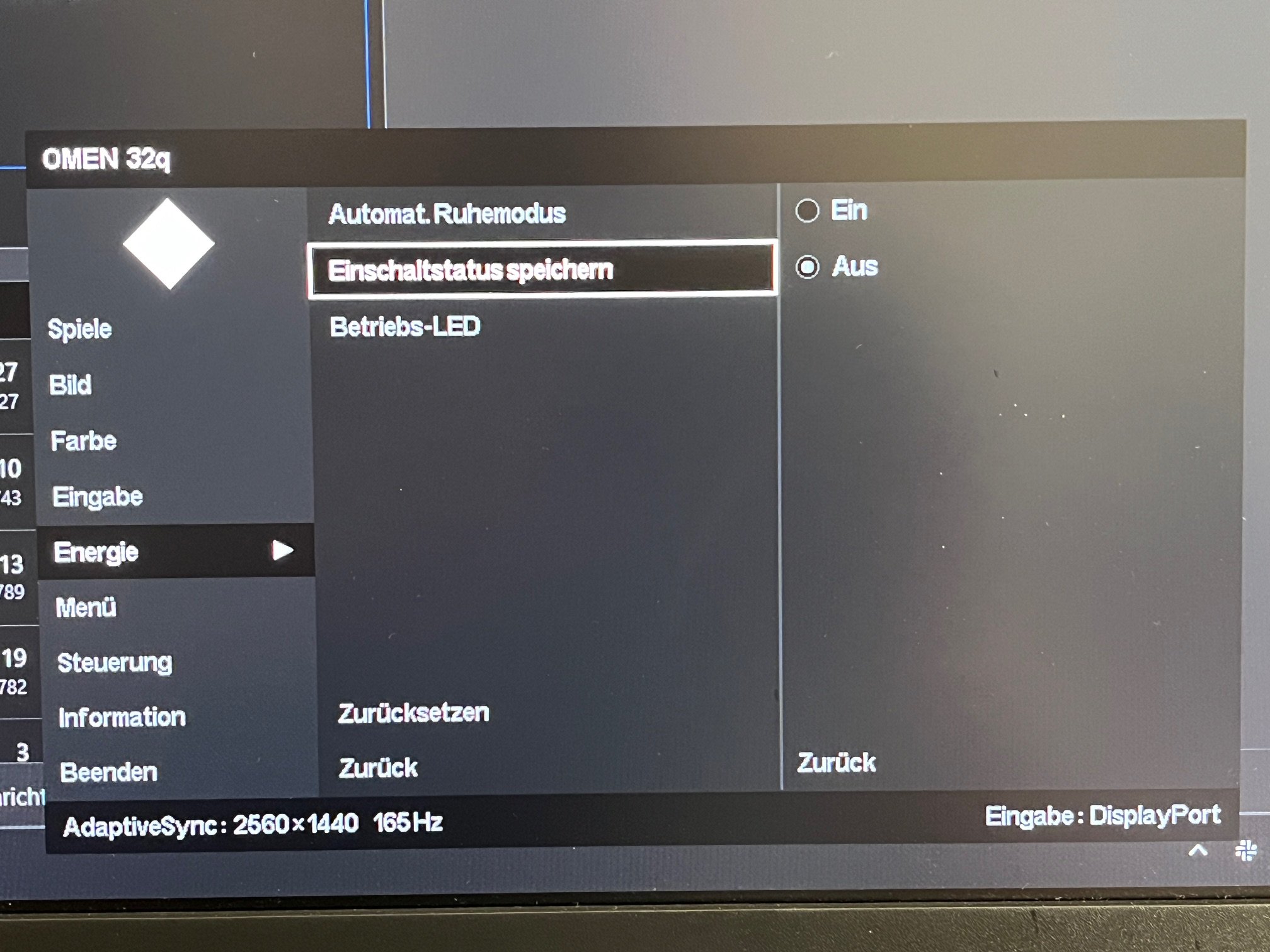 In den Monitoreinstellungen habe ich aber nur die Option, den automatischen Ruhemodus auszuschalten, dann geht er gar nicht mehr aus, wenn er kein Signal hat, oder das Speichern des Einschaltstatus auszuschalten. (siehe Foto) Letzteres habe ich jetzt mal gemacht. Mal sehen, ob er morgen früh angeht...