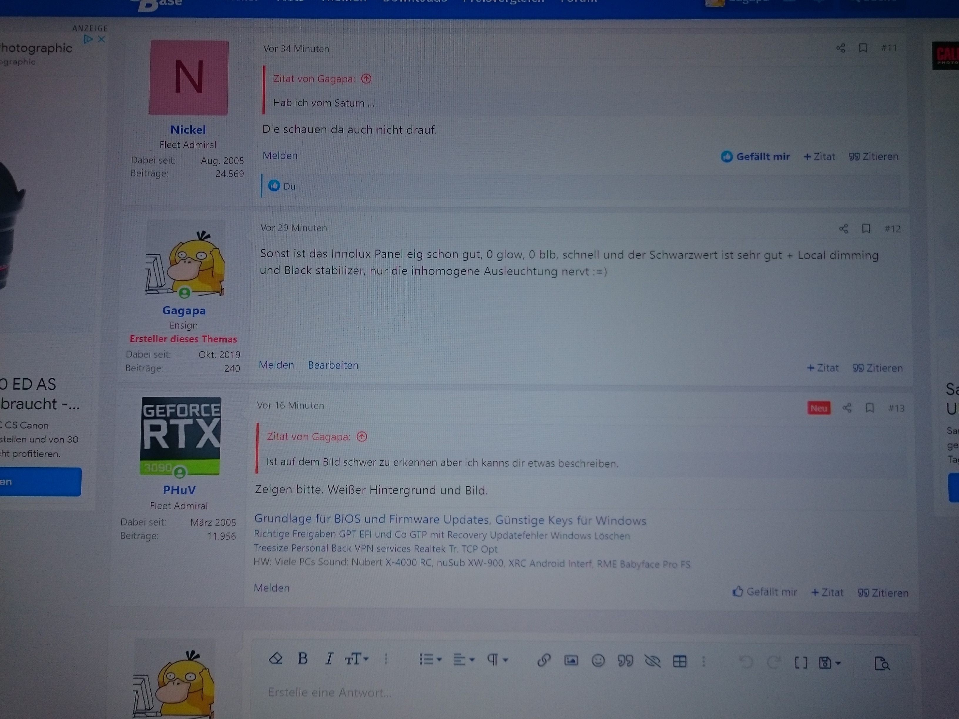 Der Monitor hat ein sehr inhomogenes Bild, die oberen 20% des Bildschirms sind schön weiß, nach dem einstellen etc,