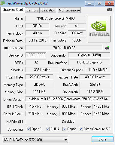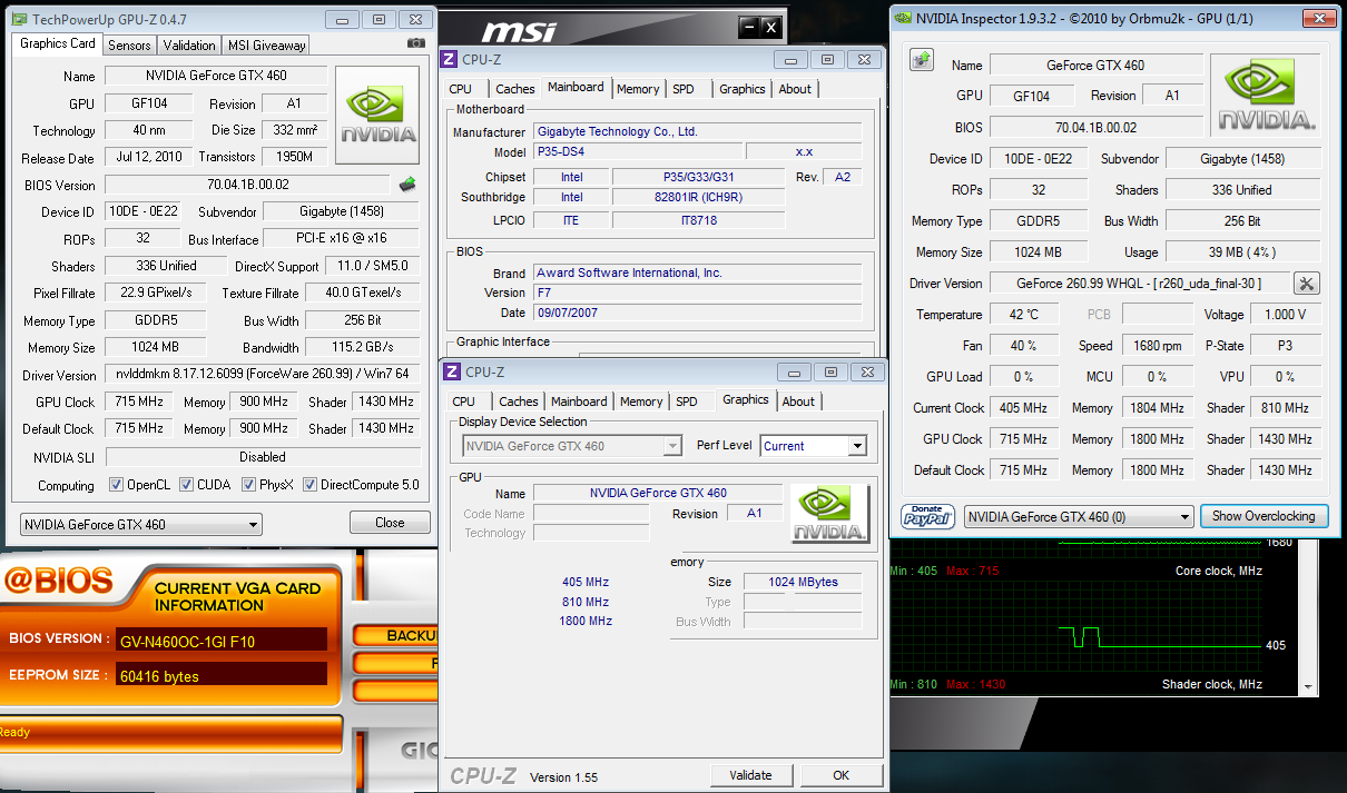 Und für die GTX 460 sollte unbedingt einer der neuen Treiber installiert werden; weil nämlich zahllose Bugs behoben wurden. Der 258.96 ist quasi älter als die GTX 460. Und: nur weil sie runtertaktet heißt das nicht das mit dem alten Treiber alles in Ordnung ist. Durch den niedrigen Takt kann es eben zu Problemen kommen; dazu gehören Tonaussetzer bei Videos oder Ruckeleffekte. Ebenso ist die Performance stellenweise wesentlich besser.