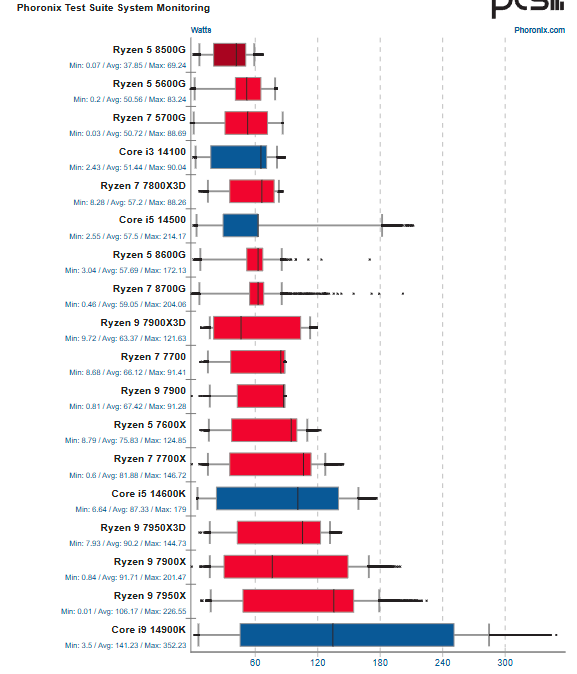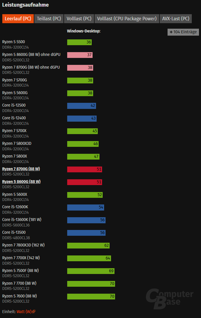 Weil hier noch einige auf den Leerlaufverbrauch schauen, bei AMD haben die G-APUs etwas 10W weniger Leerlaufverbrauch als der 7700 oder die X-CPUs. Und zumindest unsere Intel-Maschinen (Xeon-Versionen von Rocket Lake) sind nicht besonders sparsam im Leerlauf.