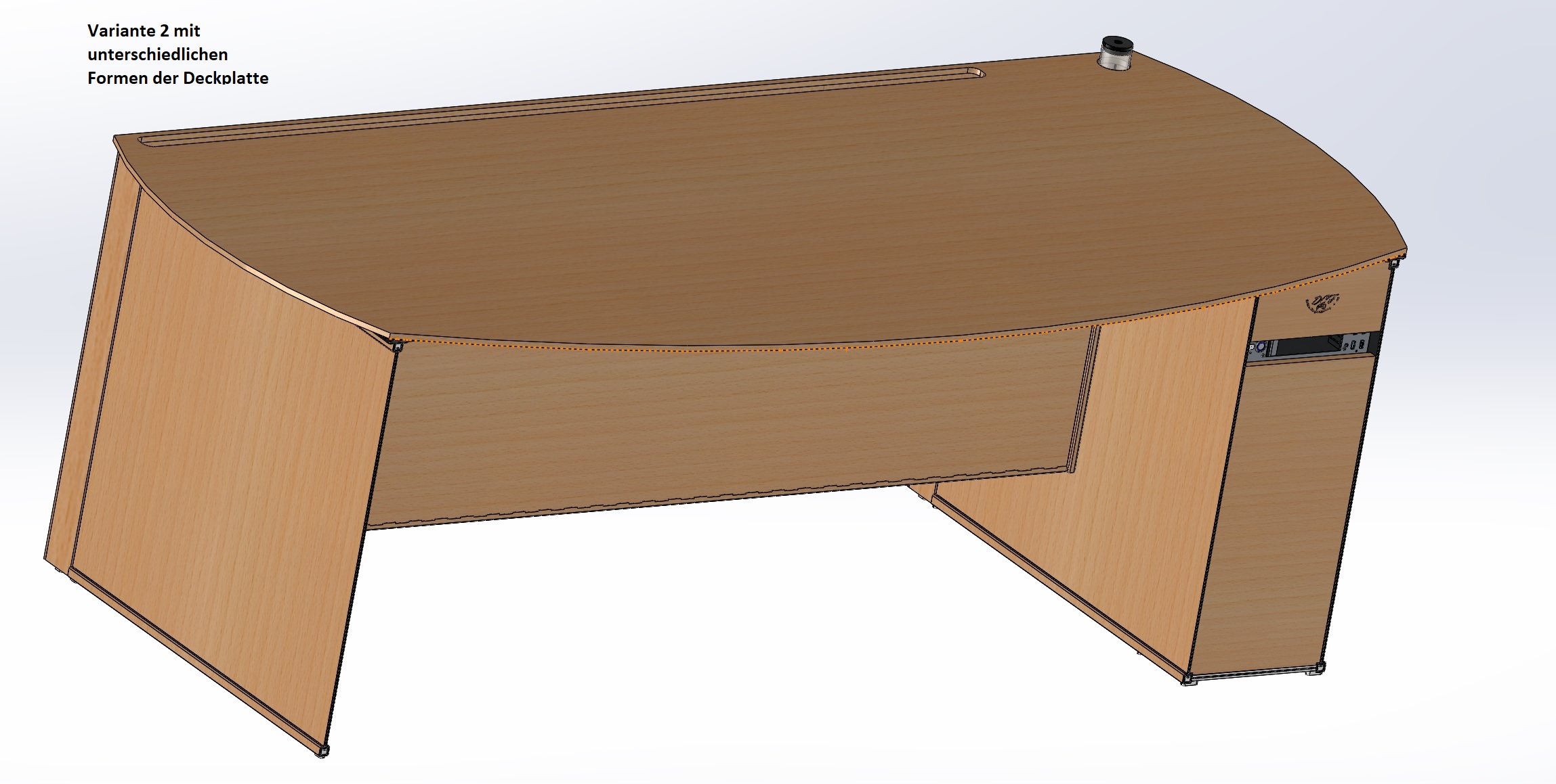 Von der V2 soll es von der Tischform bis zu neun verschieden Design geben. Die Design sind modular austauschbar. Einmal als Holzvollverkleidung und Glanzlack. In unterschiedlichen Farbvariationen und Holzarten.