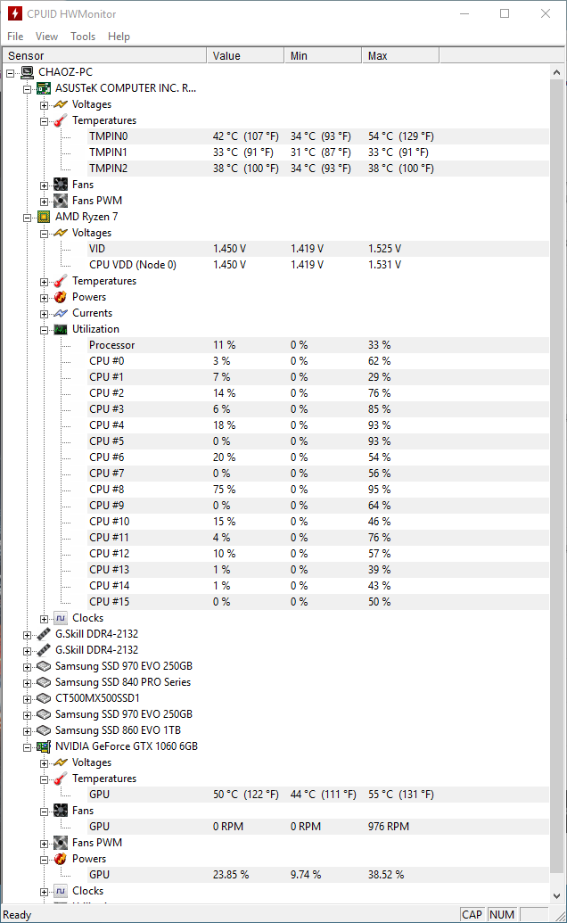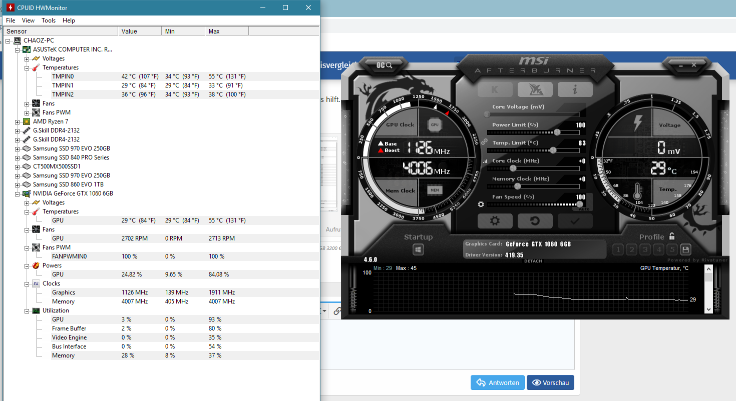 Während des Spielens waren fast alle Kerne der CPU leicht beschäftigt, GPU war bei 50% Last, die Fans gingen nicht mal an.