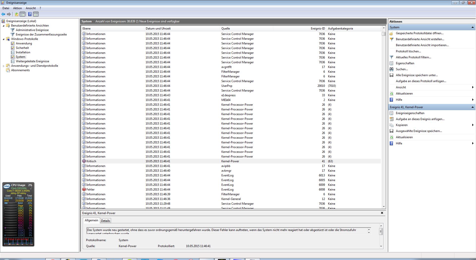 thompson004 schrieb:Die Kernel Power zeigt ja nur, dass die Kiste ungewollt neu gestartet wurde. Es gibt jede Menge Logs ( system, Anwendung, dann die Los der einzelnen Services). Interessant sind alle Fehler, die zeitlich zu den Kernel Power passen. Da diese vorhanden sind, könnten ev. vorher liegende Auslöser auch vorhanden sein. Aber du hast definitiv ein Problem.