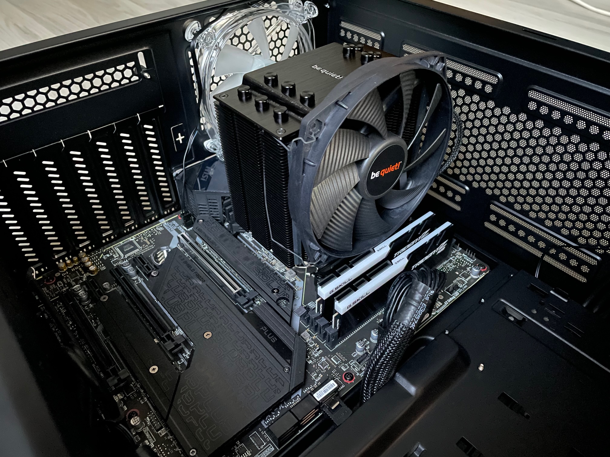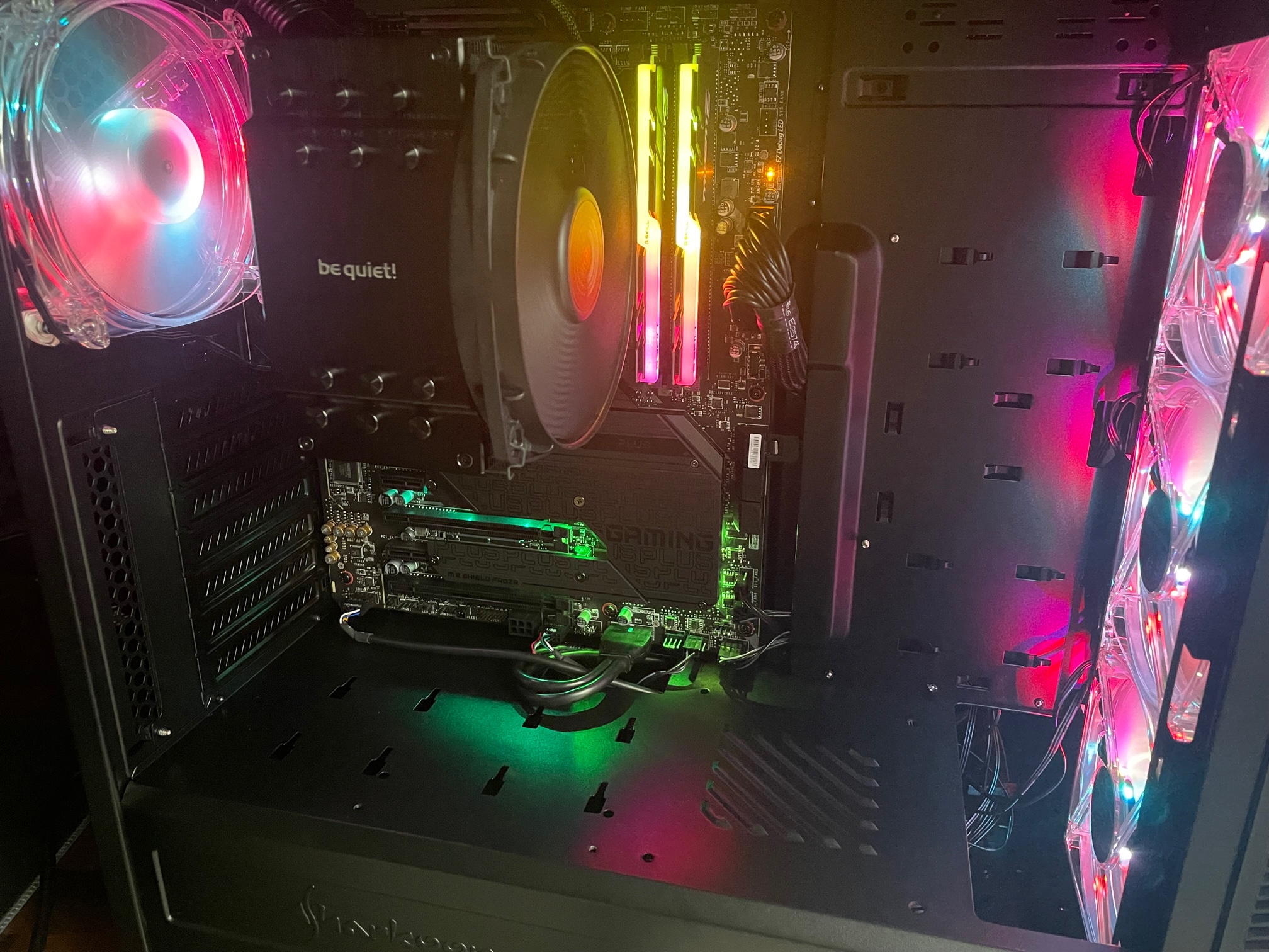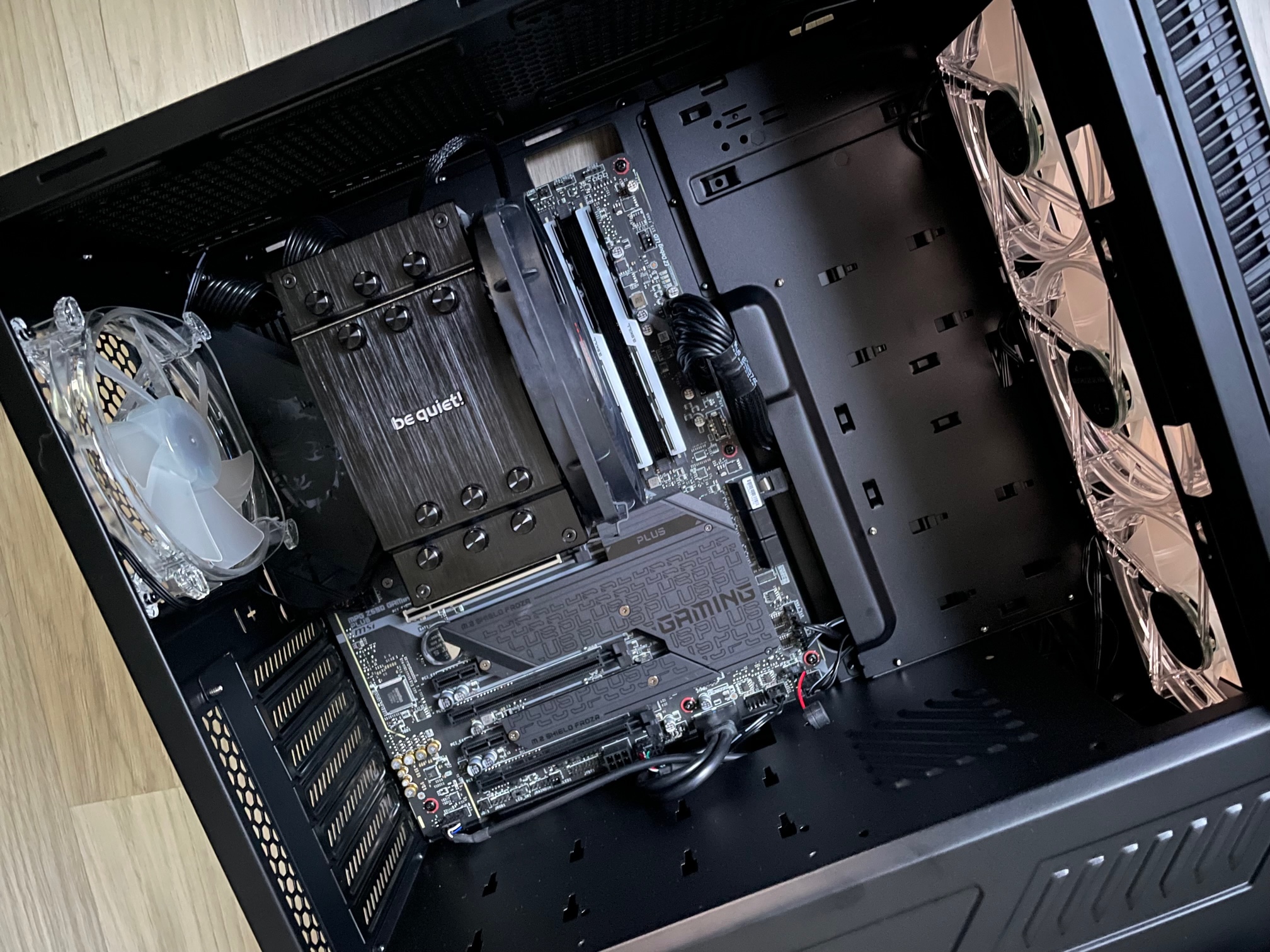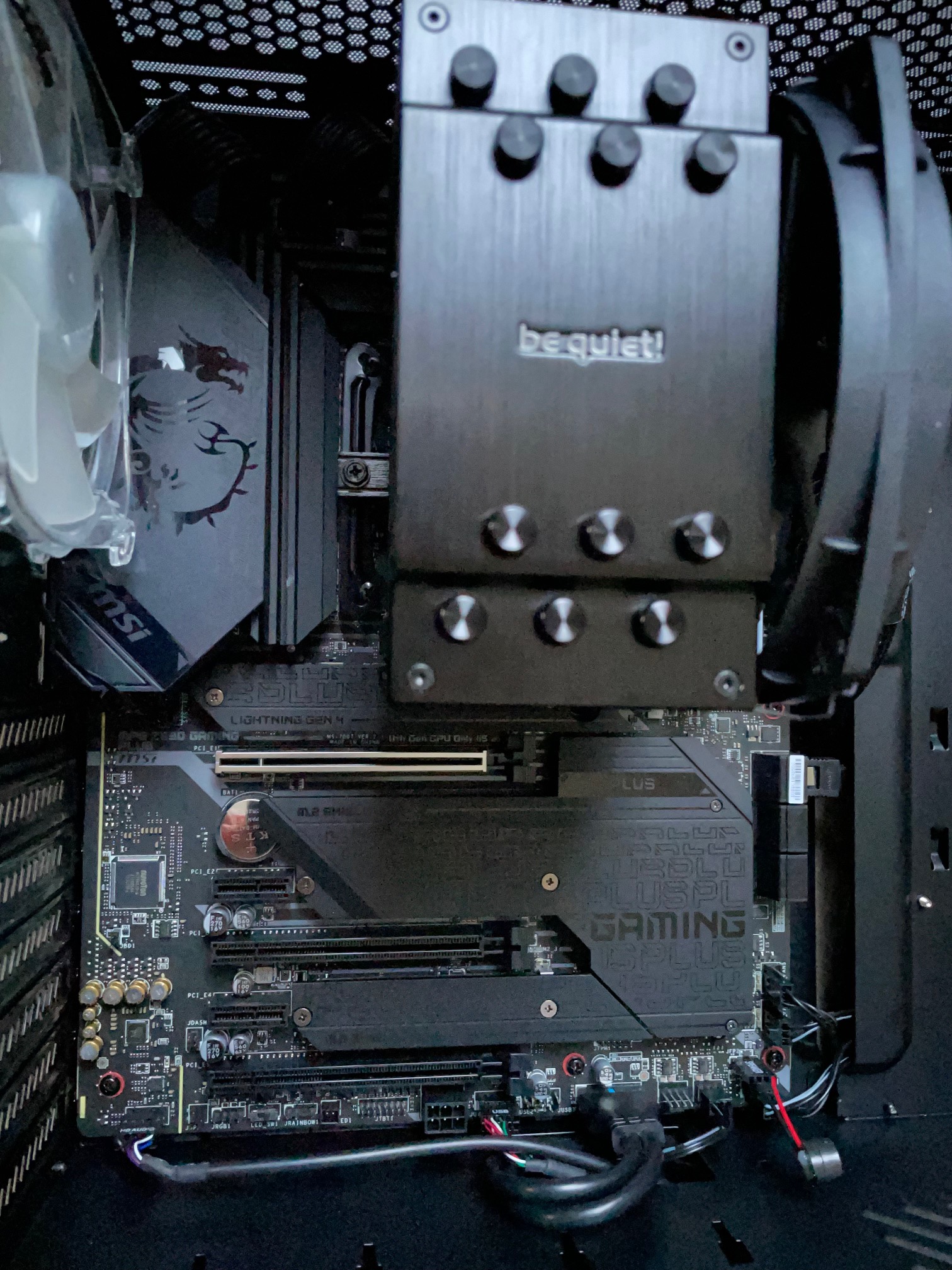 Aufgrund der aktuellen Preislage habe ich noch keine Grafikkarte zu dem System gekauft. Die Ausgabe sollte über den Grafikchip des Prozessors statt finden. Ich habe also alle Bauteile ordnungsgemäß zusammengebaut. ATX Strom und Prozessorstromkabel sind fest eingerastet. Mehr als auf den Bildern ersichtlich ist noch nicht eingebaut oder angeschlossen (außer die Frontpanel Stecker sind alle bereits auf dem Board aufgesteckt, siehe Foto). Die M2.SSD ist auf dem Steckplatz M2_1, welcher laut Anleitung für die Prozessoren der 11. Generation geignet ist.