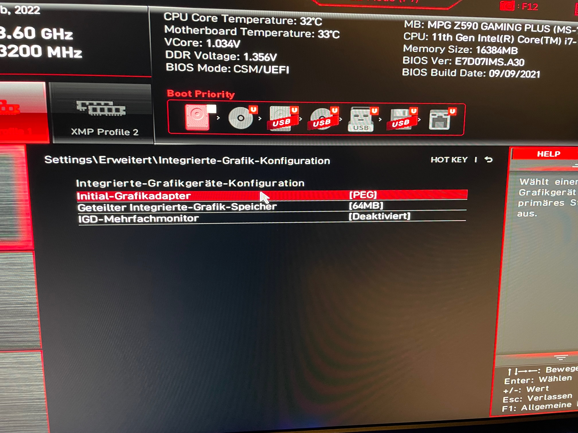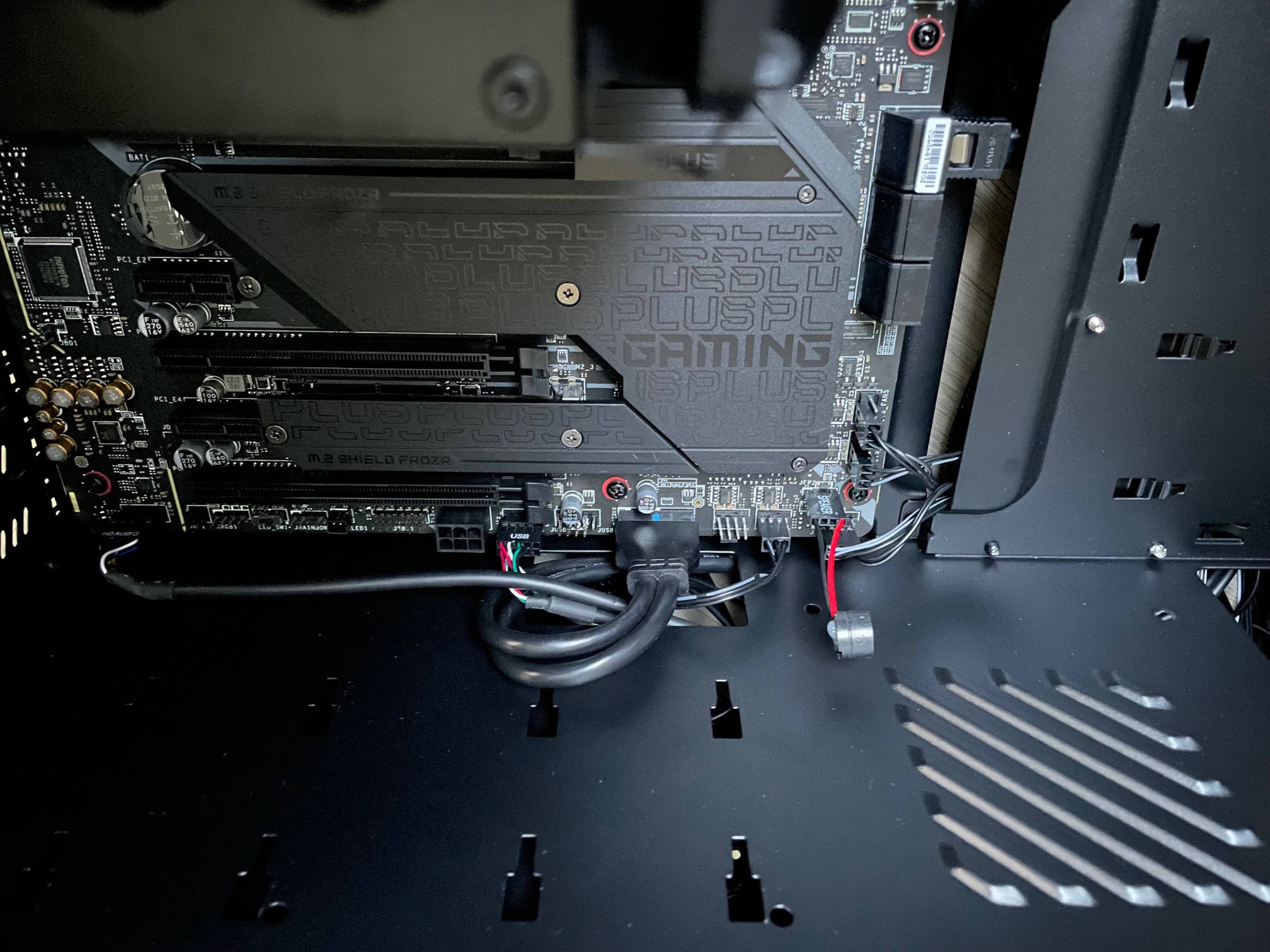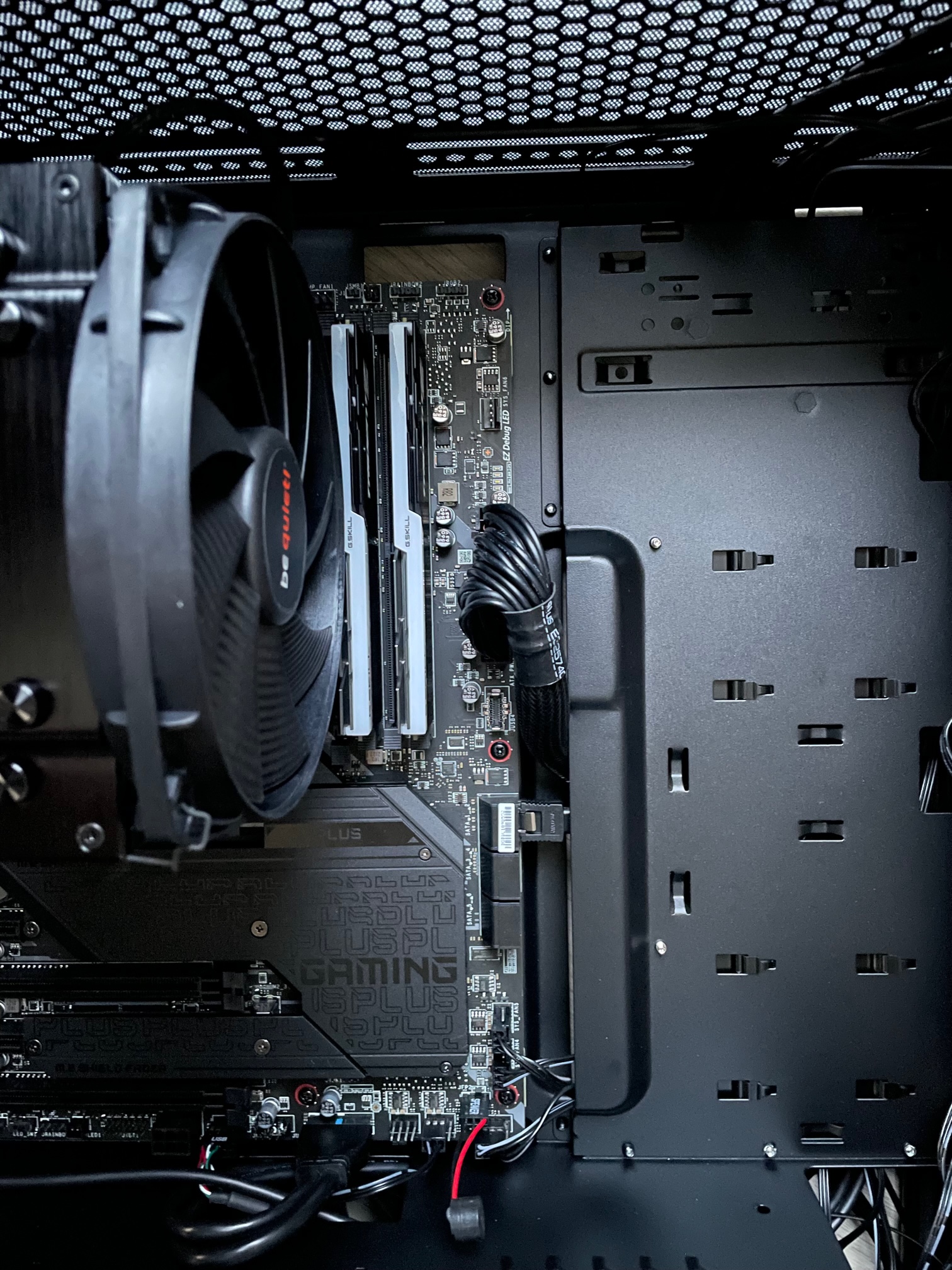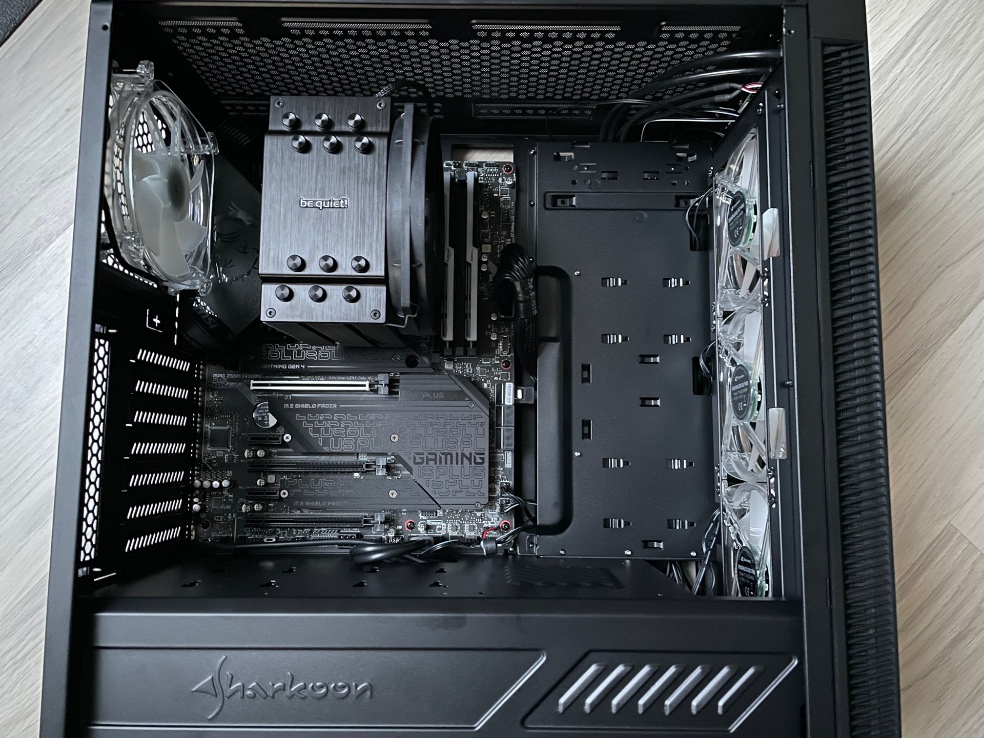 Aufgrund der aktuellen Preislage habe ich noch keine Grafikkarte zu dem System gekauft. Die Ausgabe sollte über den Grafikchip des Prozessors statt finden. Ich habe also alle Bauteile ordnungsgemäß zusammengebaut. ATX Strom und Prozessorstromkabel sind fest eingerastet. Mehr als auf den Bildern ersichtlich ist noch nicht eingebaut oder angeschlossen (außer die Frontpanel Stecker sind alle bereits auf dem Board aufgesteckt, siehe Foto). Die M2.SSD ist auf dem Steckplatz M2_1, welcher laut Anleitung für die Prozessoren der 11. Generation geignet ist.