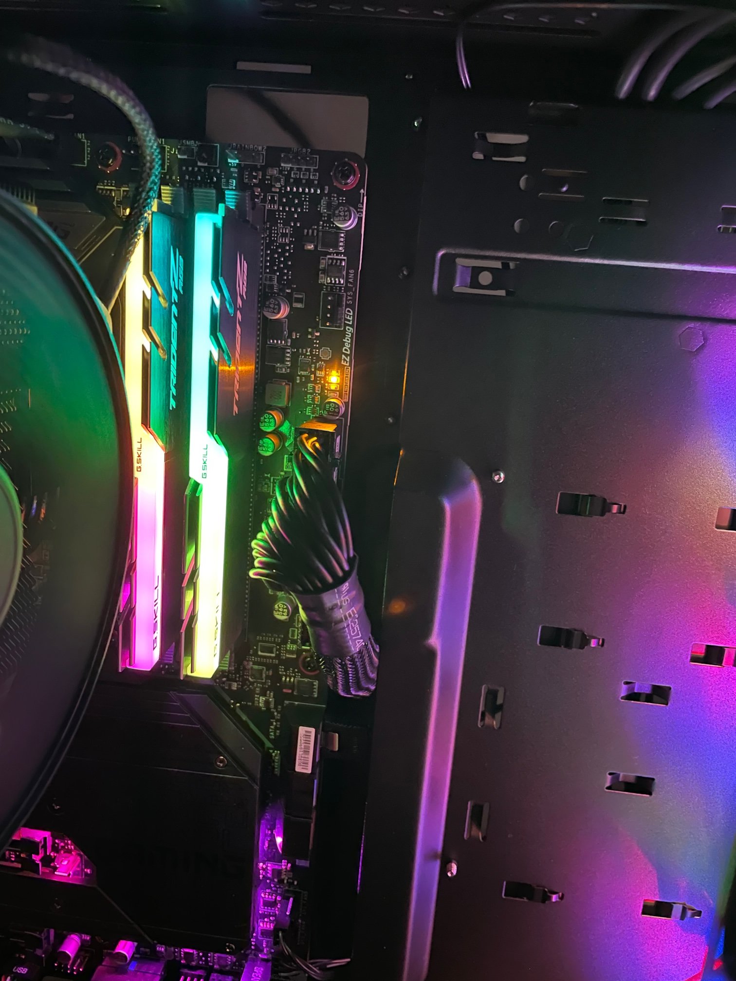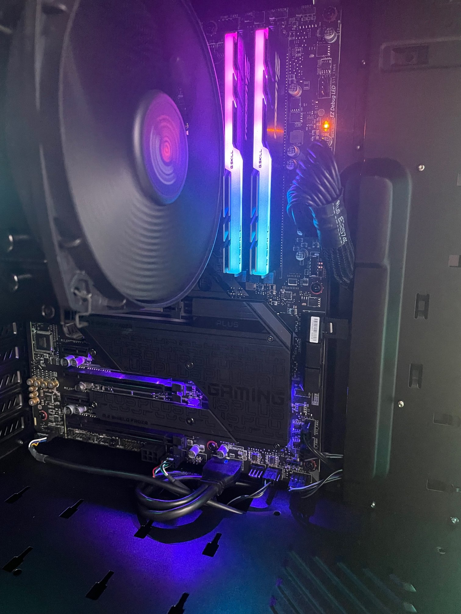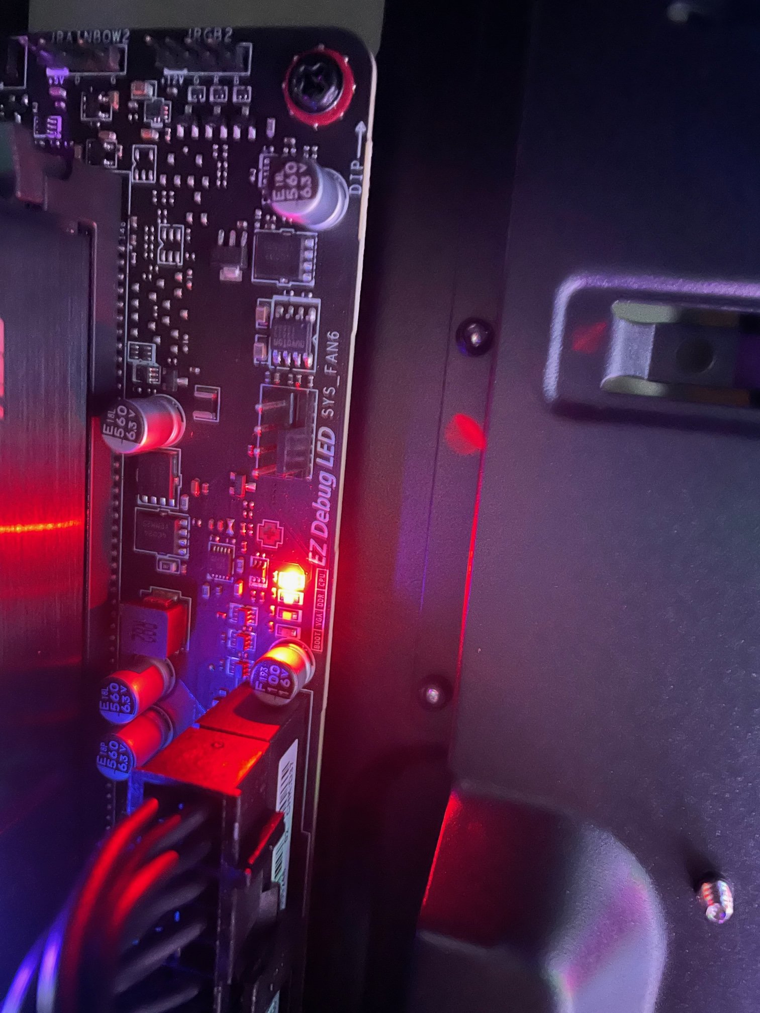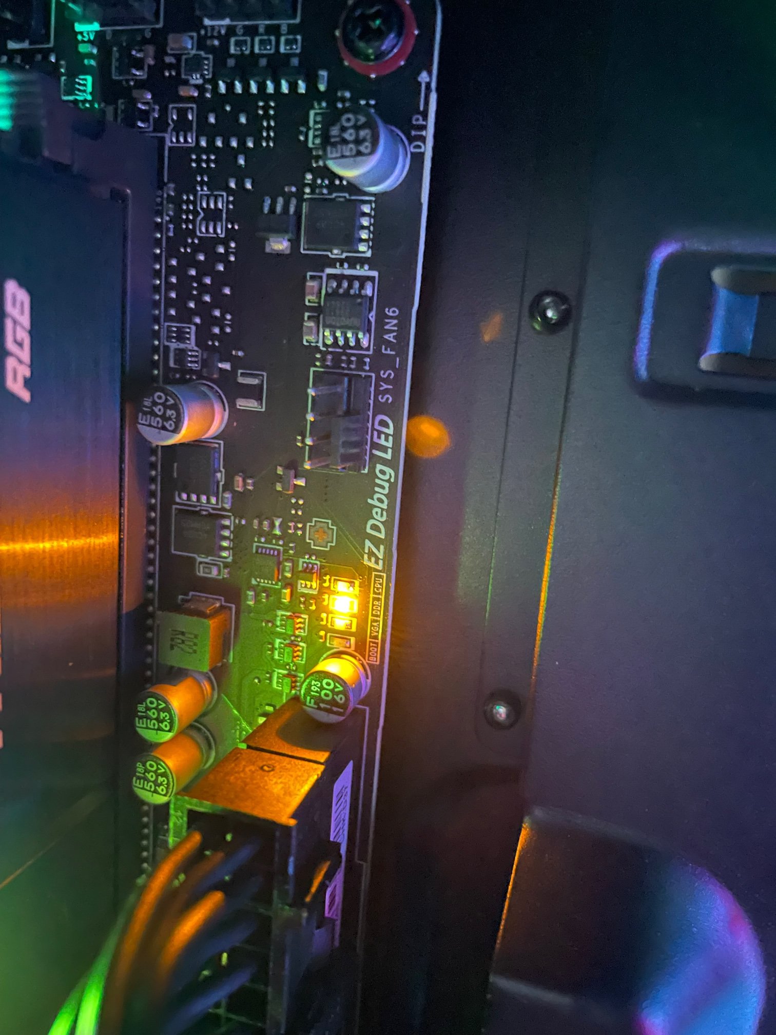 Wenn ich nun den An-Schalter bestätige laufen alle Lüfter an, alles leuchtet. Aber es wird kein Bild ausgegeben. Der Speaker macht keinen Mucks. Auf dem Mainboard beim EZ Debug LED leuchtet die DDR-LED gelb und die CPU LED rot, immer im Wechsel.