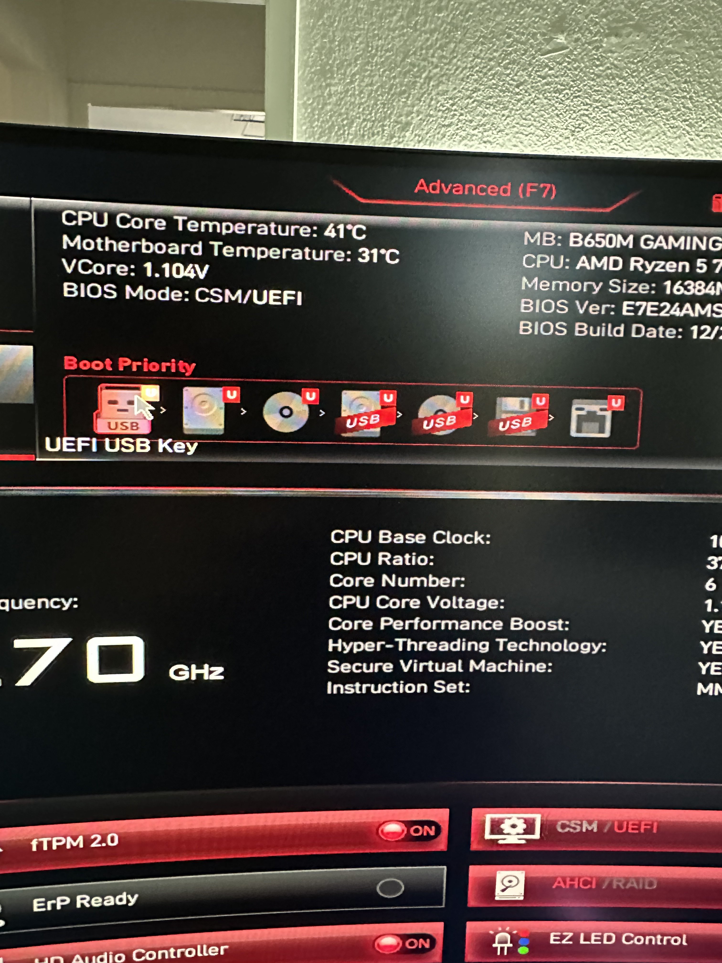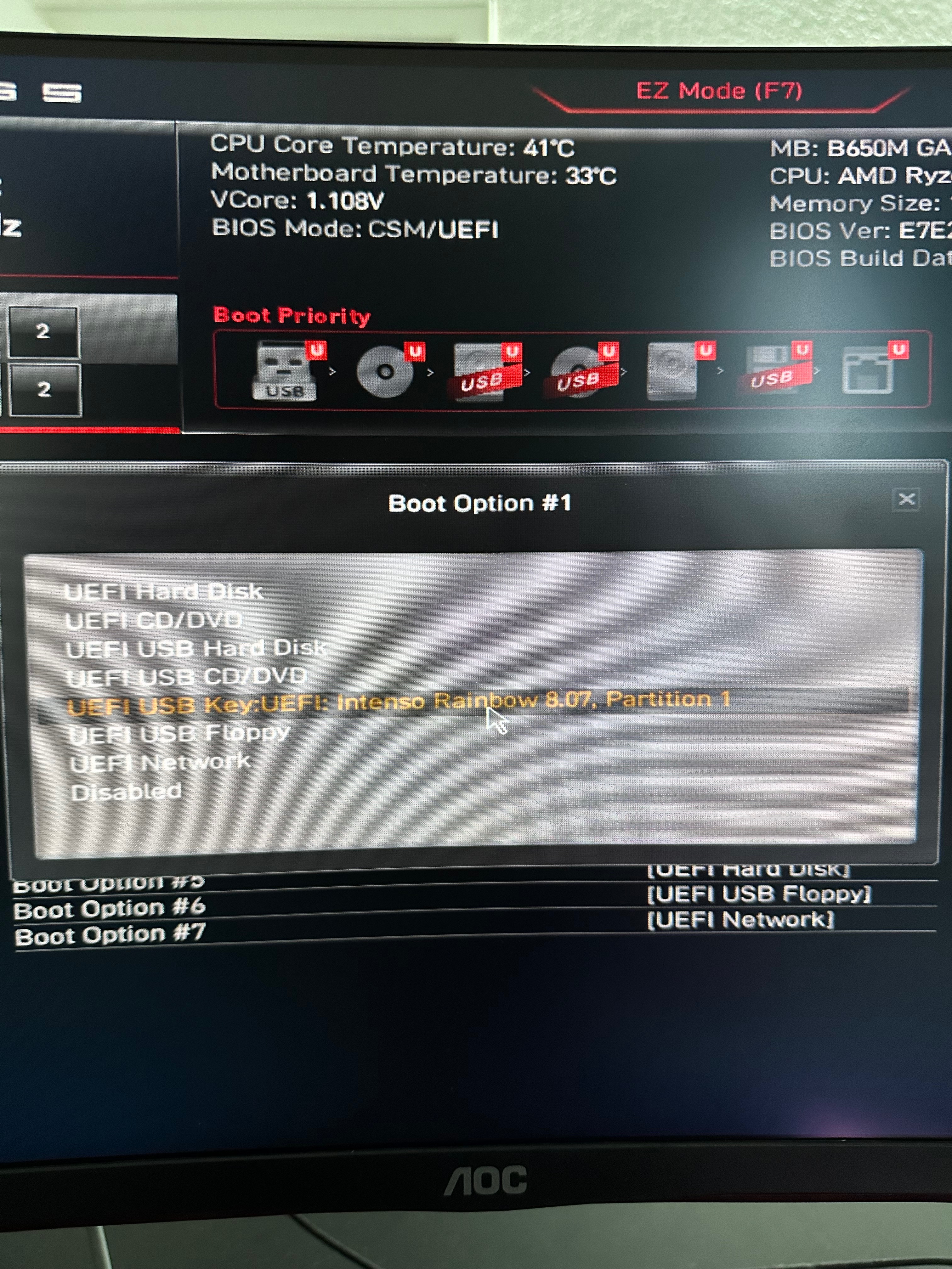 Das Problem ist, er startet zwar, geht direkt ins Bios, wenn ich aber die Bootreihenfolge auf den Stick zuerst ändere, startet er neu, dann aber mit einem Blackscreen.