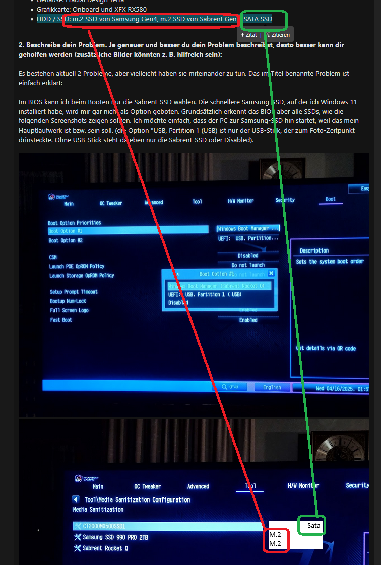 Im BIOS kann ich beim Booten nur die Sabrent-SSD wählen. Die schnellere Samsung-SSD, auf der ich Windows 11 installiert habe, wird mir gar nicht als Option geboten. Grundsätzlich erkennt das BIOS aber alle SSDs, wie die folgenden Screenshots zeigen sollten. Ich möchte einfach, dass der PC zur Samsung-SSD hin startet, weil das mein Hauptlaufwerk ist bzw. sein soll. (die Option "USB, Partition 1 (USB) ist nur der USB-Stick, der zum Foto-Zeitpunkt drinsteckte. Ohne USB-Stick steht da eben nur die Sabrent-SSD oder Disabled).
