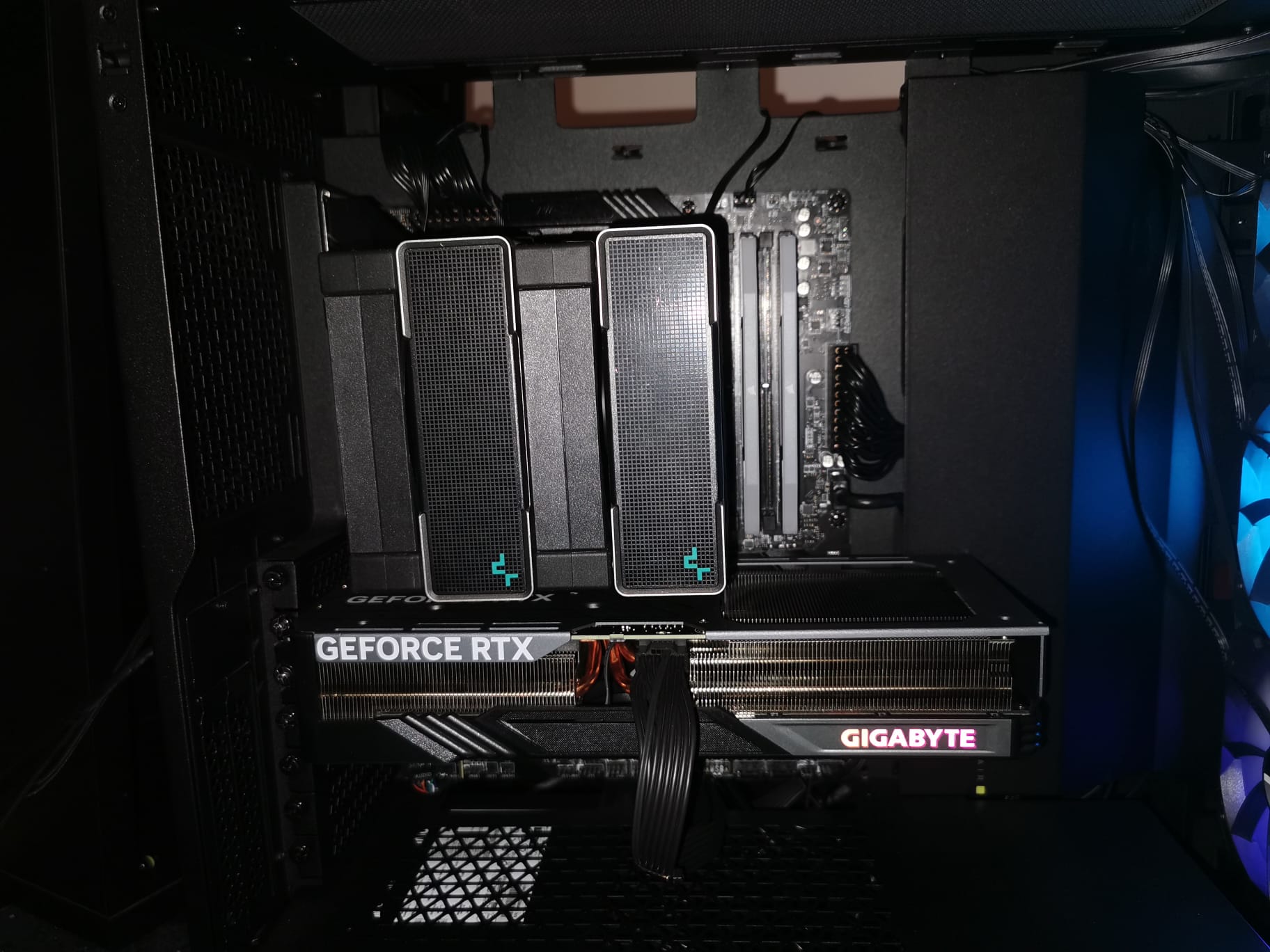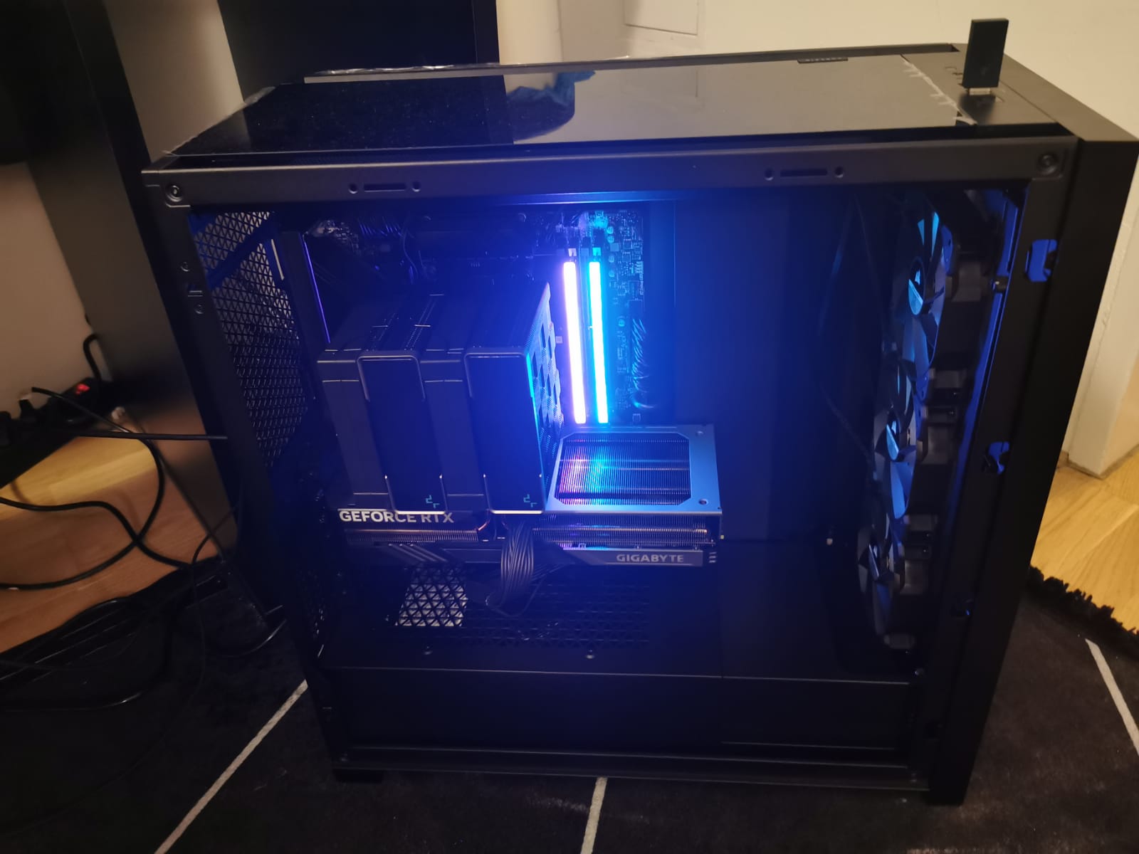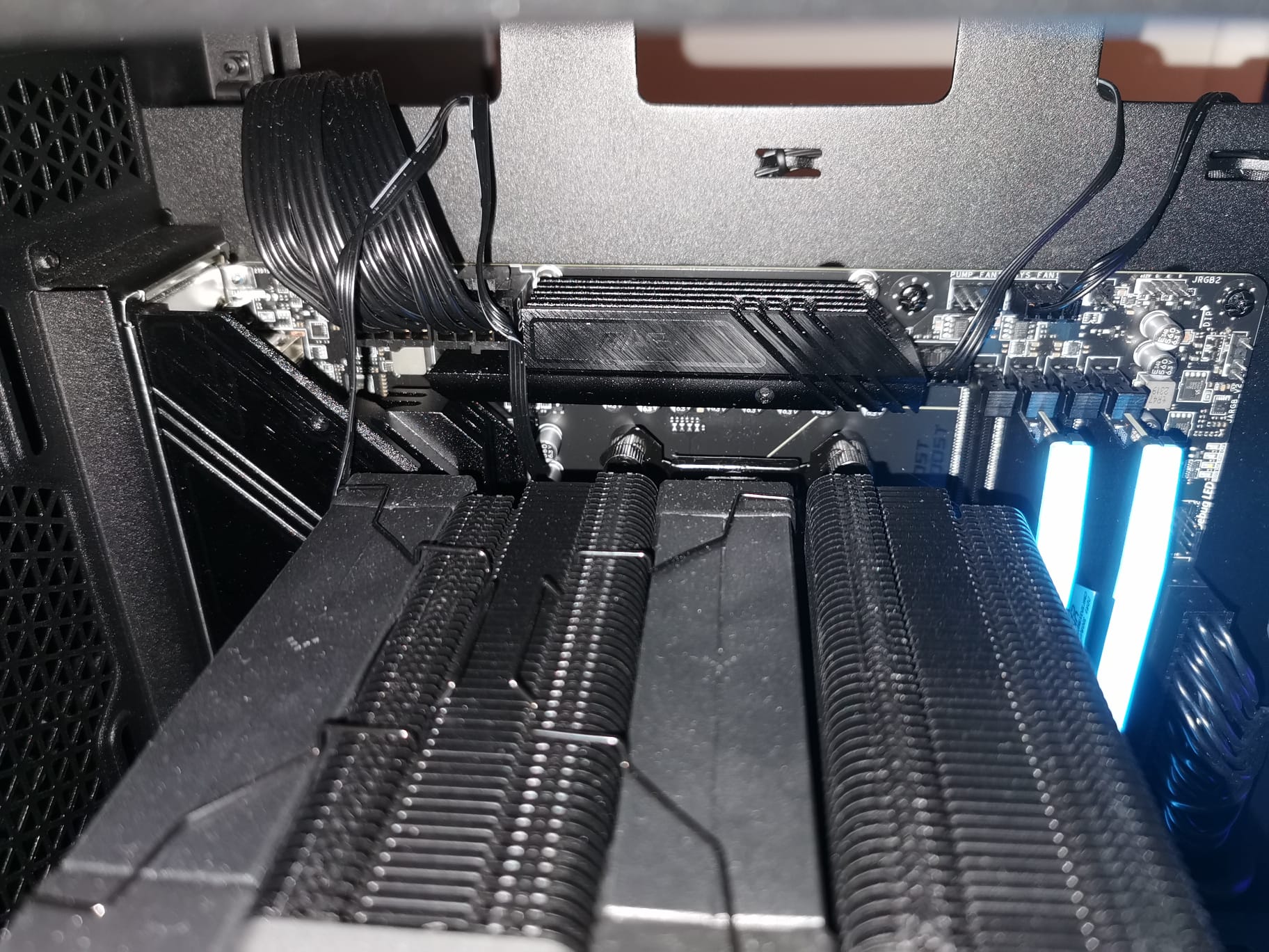 Ich könnte den linken Lüfter auch leicht rechts über dem RAM versetzt montieren, ist halt optisch störend. Es stimmt schon, dass der die Hitze beim Rechten Radiator somit nur gesaugt wird, er wird aber zumindest von den Case Lüftern beblasen und die Warme luft wird durch den Lüfter links besser nach außen transportiert, da ich momentan ja eh keinen Hecklüfter habe.