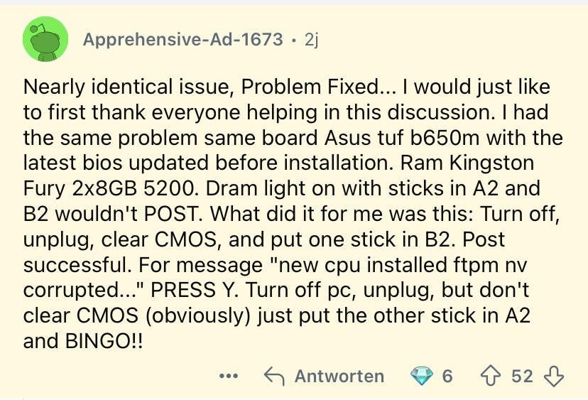 Jetzt weiß ich leider nicht was ich noch machen könnte. Das einzige was mir durch den Kopf geht, irgendwas stimmt nicht mit dem MB und ich muss es leider tauschen oder irgendwas stimmt nicht mit den RAM Riegeln und die müssten einmal getauscht zurück.