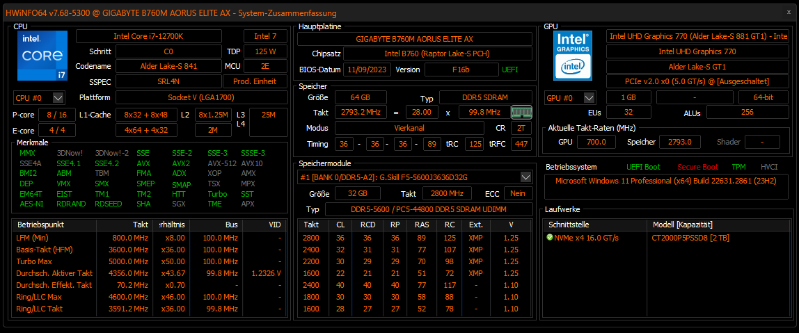 - Arbeitsspeicher (RAM): G-Skill…5800MHZ ddr5 / 64GB / 2x 32GB