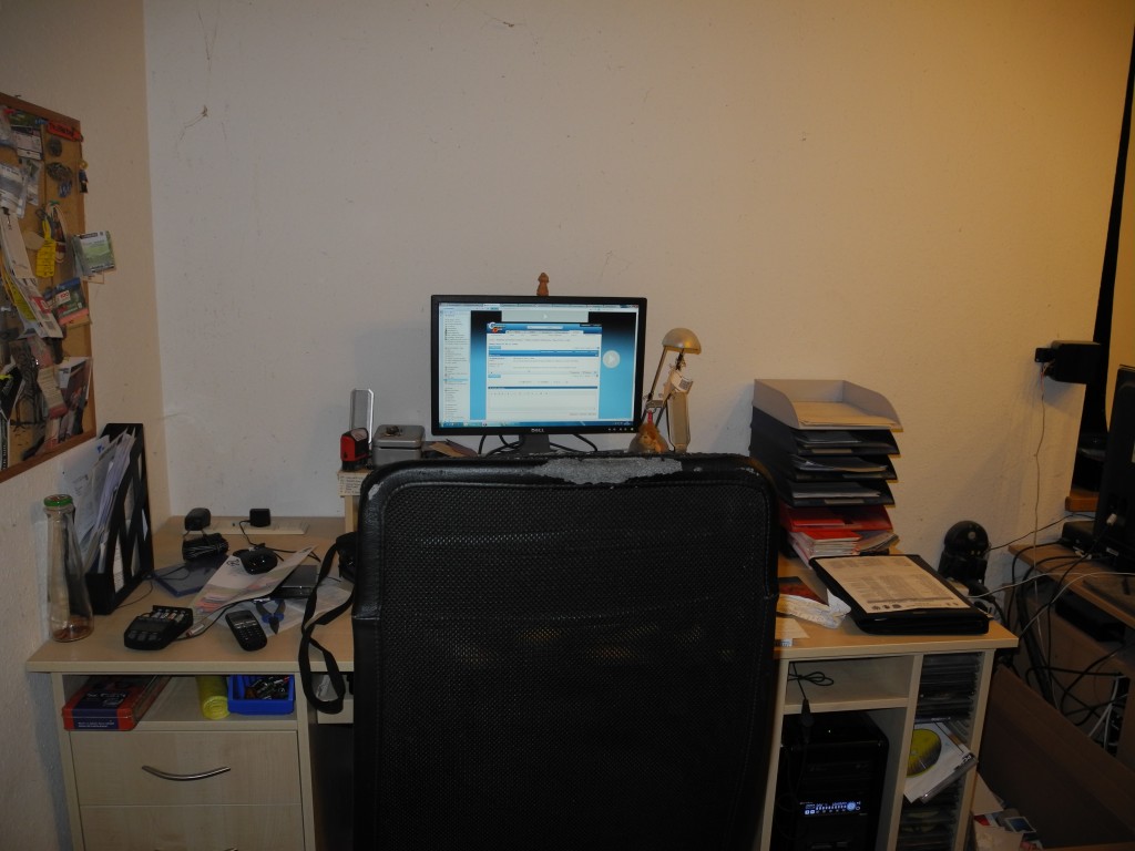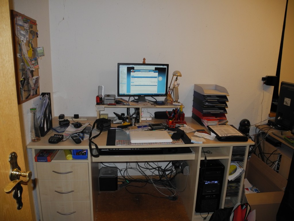 Hier sind zwei Fotos von meinem Schreibtisch (heute sogar halbwegs ordentlich ;-) )