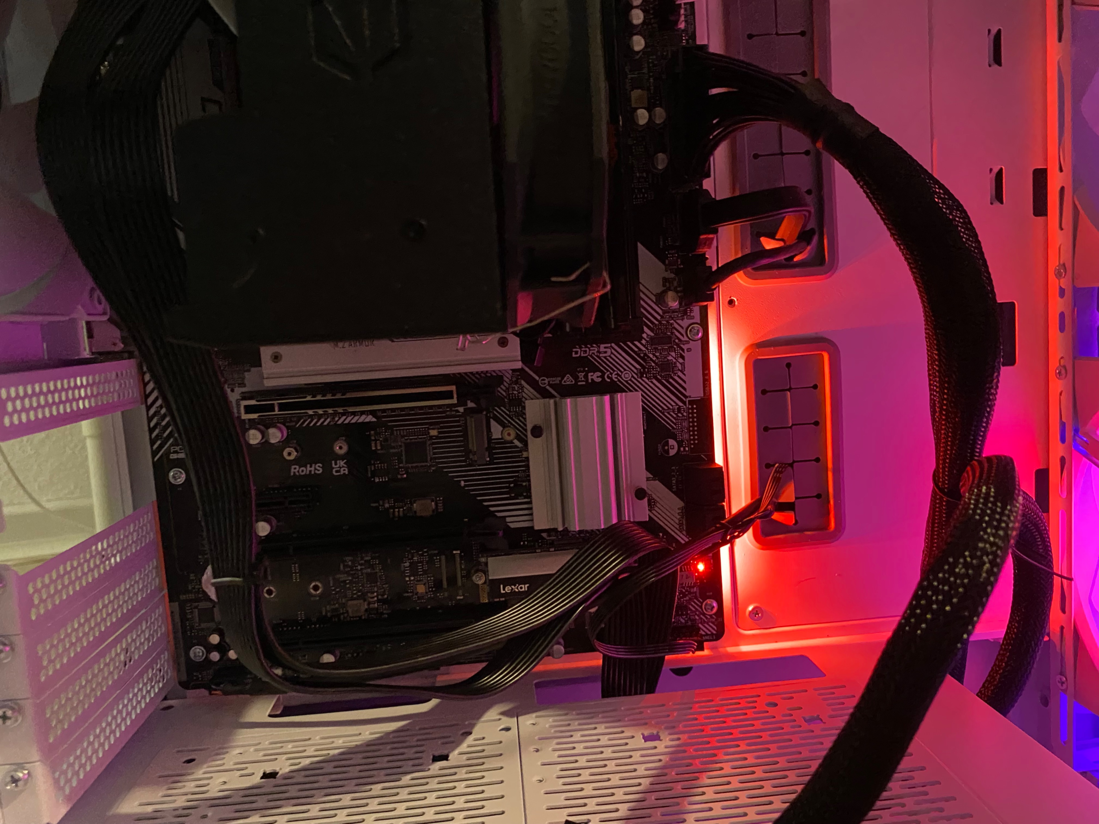Nachdem verkabeln, bei der Generalprobe gingen zwar einige LEDs sowie das Mainboard (kurz) und der CPU Kühler an.