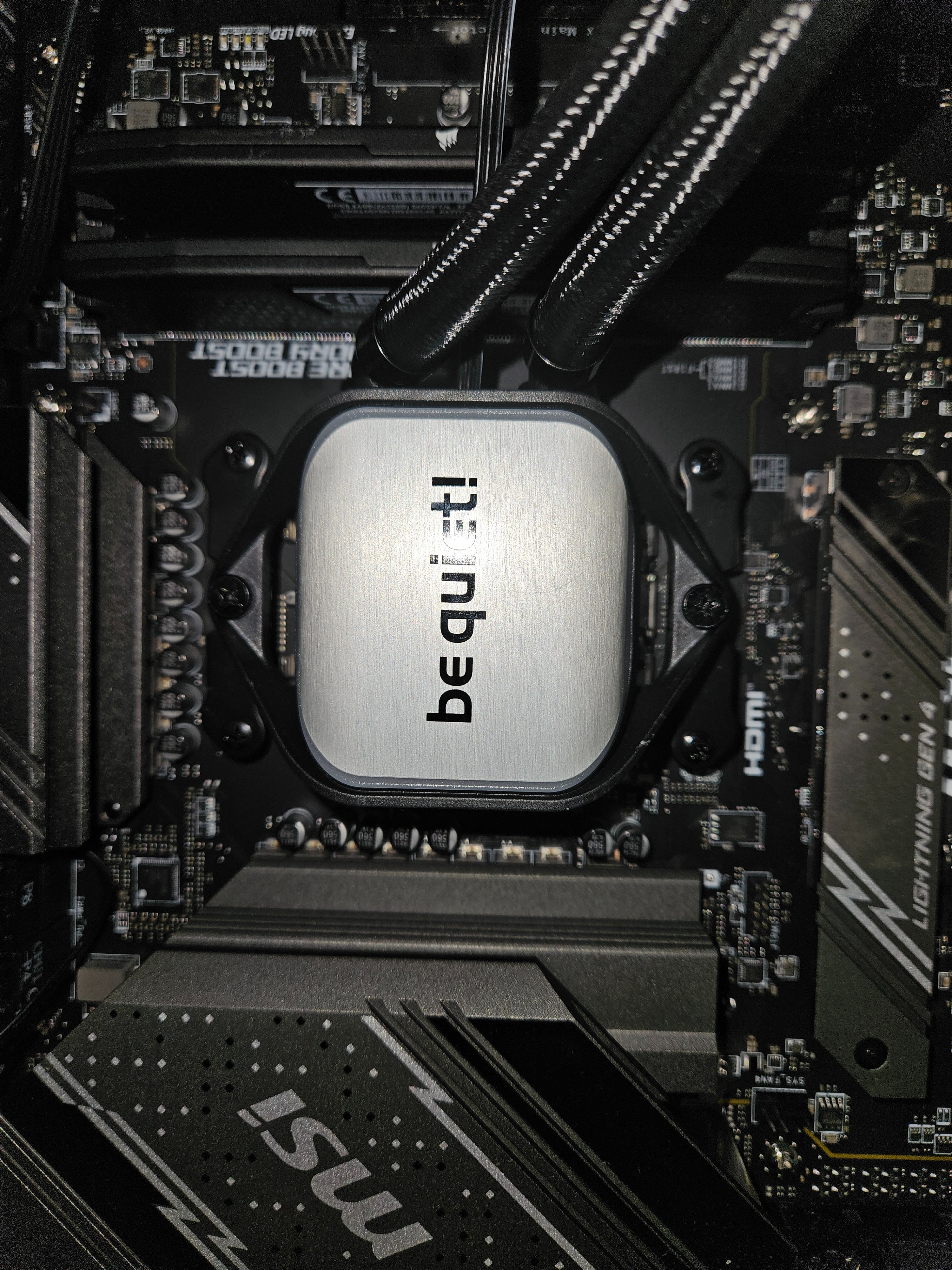 - Nochmal die CPU kontrolliert, alle Pins in Ordnung, Sitzt richtig (Pfeil zeigt auf Pfeil), Kühler sitzt richtig drauf inkl. Wärmeleitpaste.