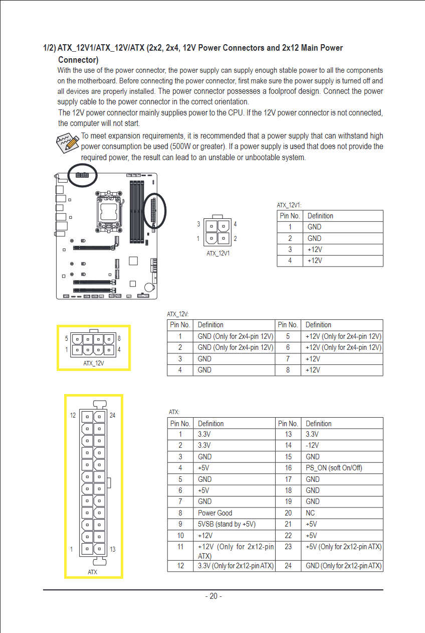 b) Vielleicht der Knackpunkt: Das Netzteil hat zwei 4 Pin Anschlüsse für die CPU Stromversorgung (Beschriftung P4 P8), das Mainboard hat einen 4 Pin und einen 8 Pin Anschluss für die 12V Stromversorgung. Ich habe nur den 4 Pin Stecker in die 4 Pin Buchse. So ist er anfangs auch hochgefahren und ich konnte die ersten Einstellungen vornehmen.