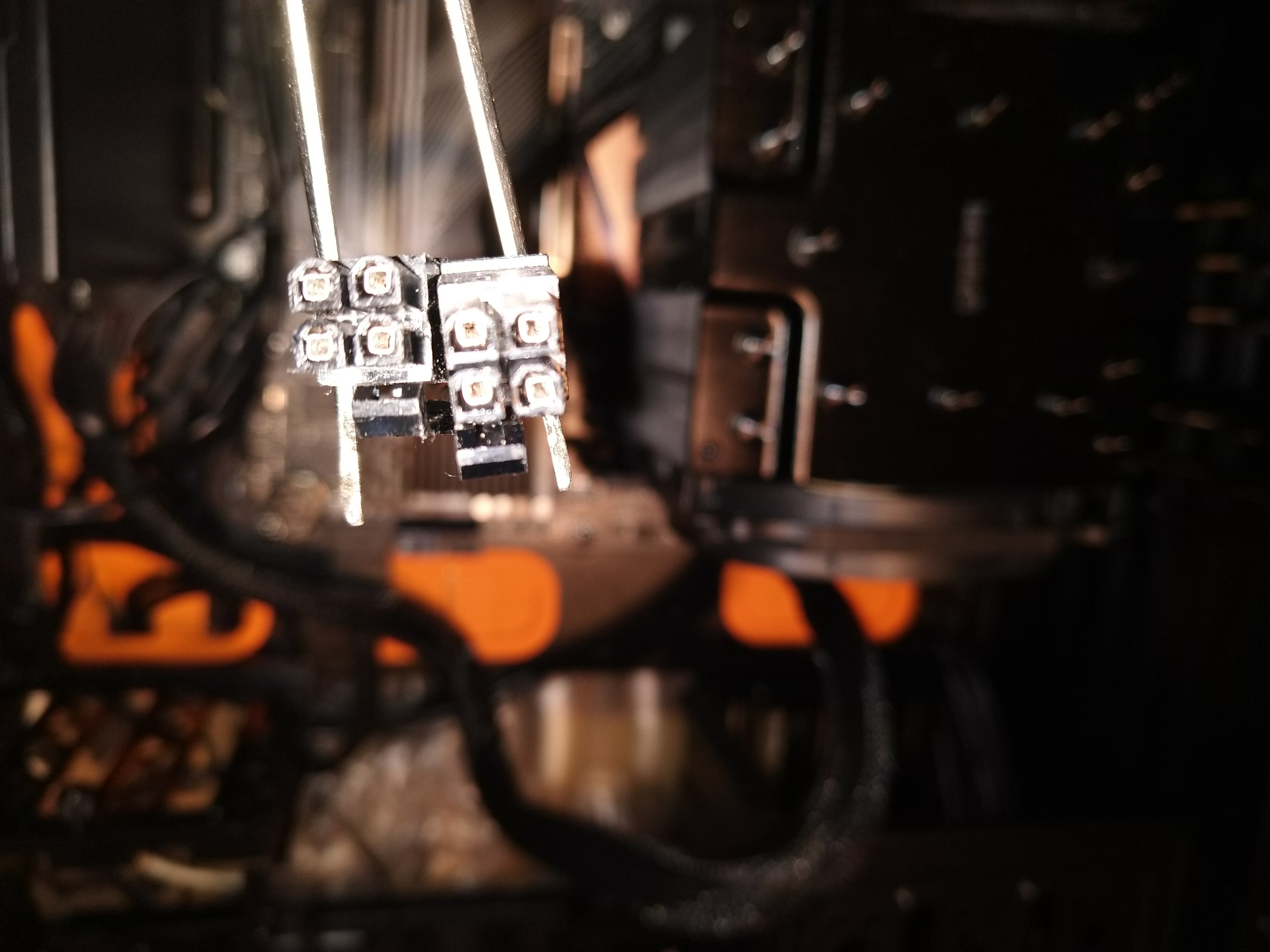 Ich kann die zwei 4 Pin Stecker auch nicht in die 8 Pin Buchse stecken, da er nicht passt. Auch gelesen habe ich, dass manche die zwei 4 Pin Stecker zu einem 8 Pin Stecker zusammenstecken können, das geht bei mir aber nicht.