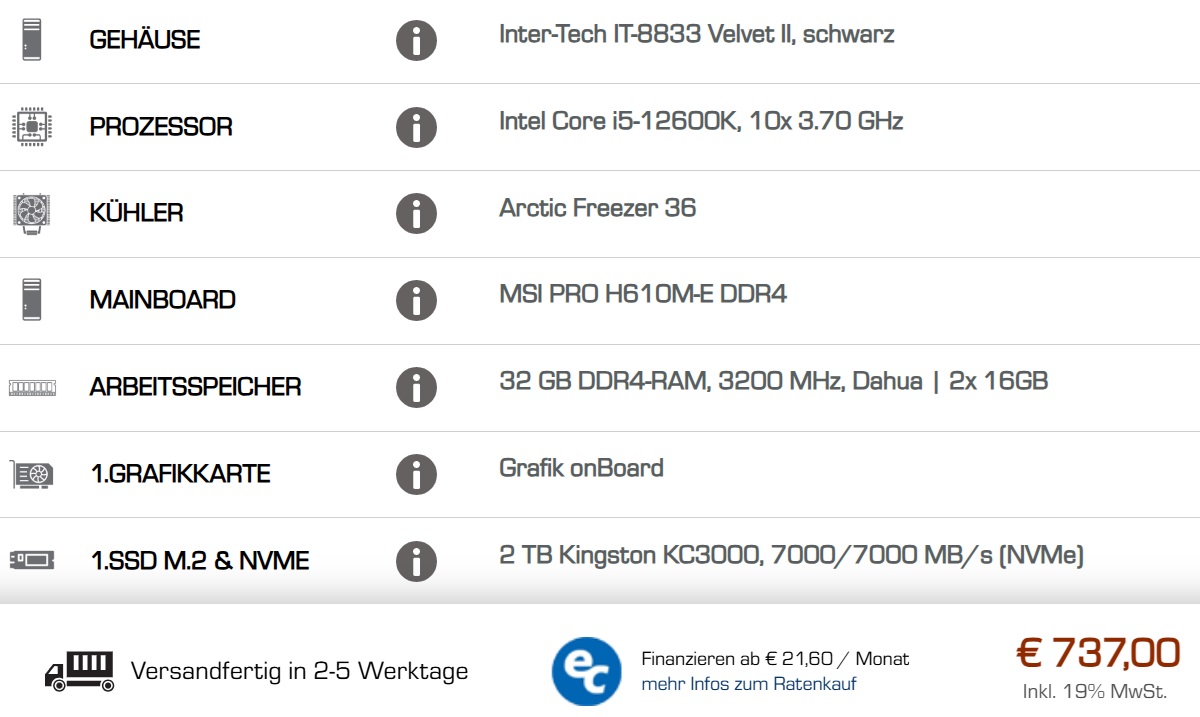 haben ihm auch schon genügend Konfigs vorgeschlagen, auch von günstigeren Händlern wie bei Systemtreff für 650€Verak Drezzt schrieb:würde dann doch die Konfig mit dem 5700G für 650€ bei Systemtreff vorziehen