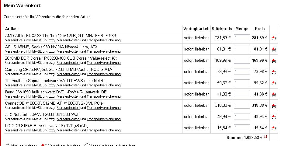 oP2 schrieb:Achso u ich würd aufjedenfall die 'boxed' version nehmen. Sie ist nur 15 € teurer u du hast dann 3 Jahre Garantie u nicht nur 6 Monate Gewährleistung. Den Kühler würd ich dann naja z.B gegen einen Scythe Ninja Plus oder auch nur einen Katana austauschen, den gibt es grad bei Caseking für 19,90 (ich hab den u bin damit sehr zufrieden, hab aber auch nur einen 2600+ amd)