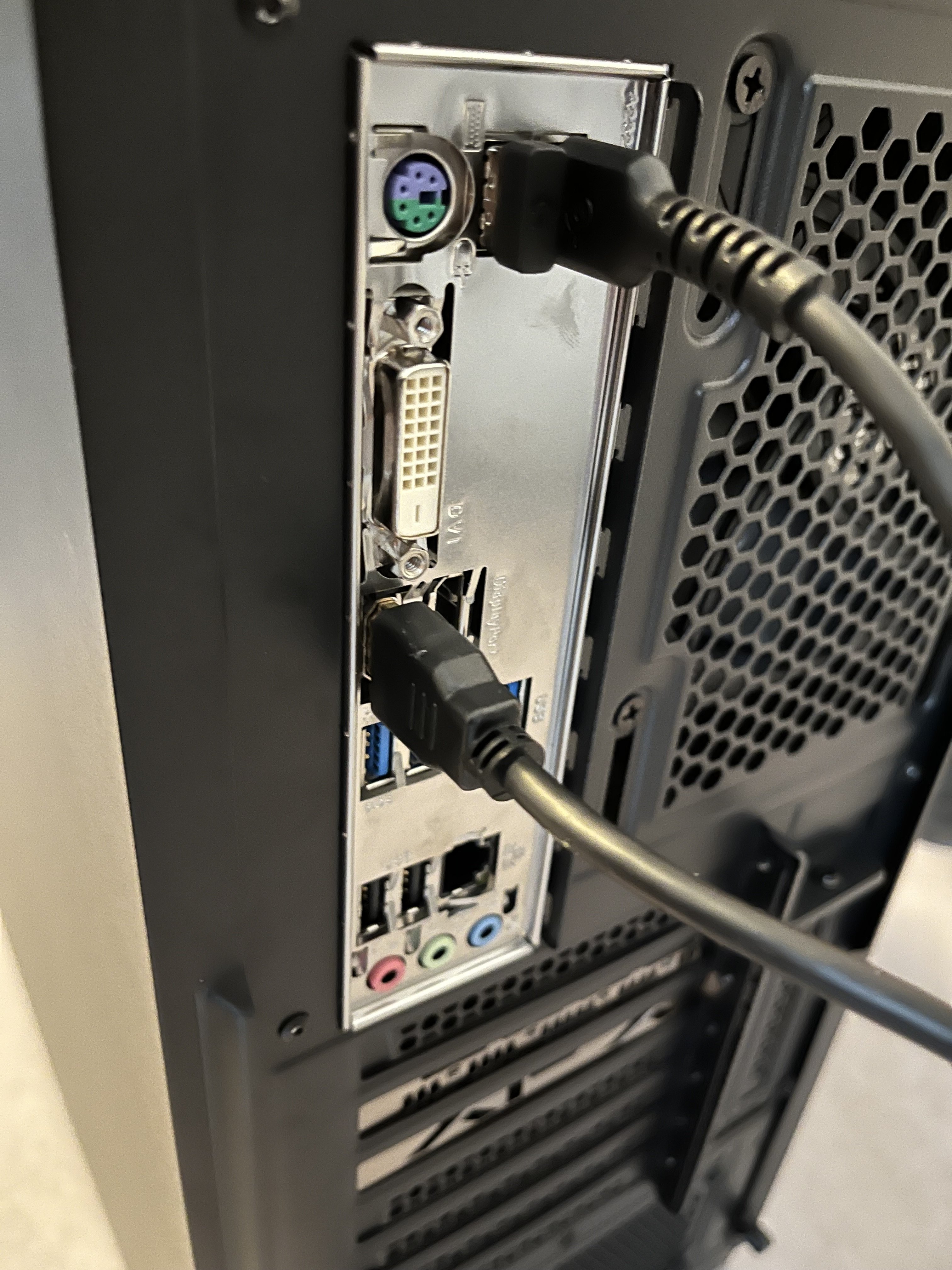 Mach mal ein Bild von der Rückseite des PCs, ebenso mehr Info was du genau bestellt hast (Hardware im PC) wäre hilfreich.