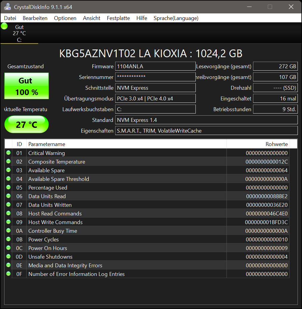 Unten habe ich derzeit 3 Bilder angehängt - damit ihr das Gehäuse und die Anschlüsse sehen könnt und ebenso den allerersten Info-Screenshot über die interne SSD (als ich den Screenshot der SSD machte habe ich den PC zum 2. Mal eingeschaltet gehabt - mit der SSD wurde scheinbar schon zuvor nicht sehr gut behandelt da 4x hart abgeschaltet/stromlos).