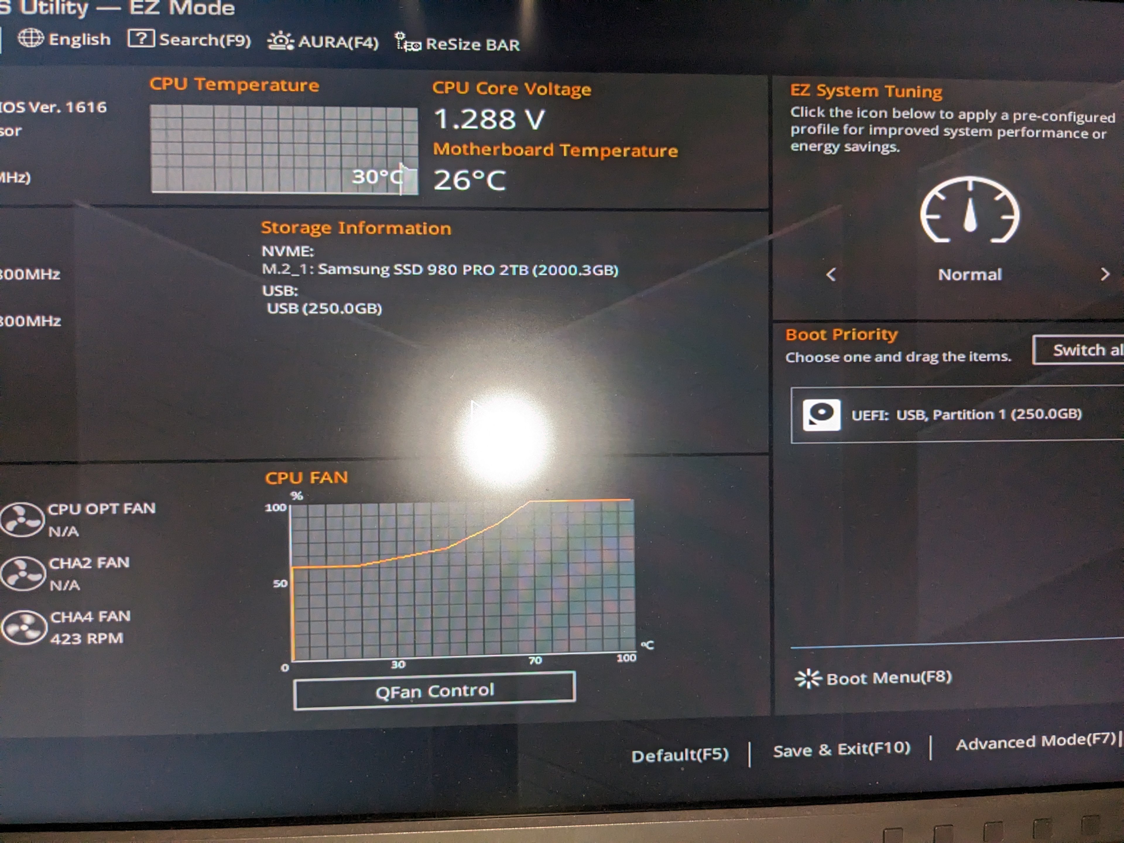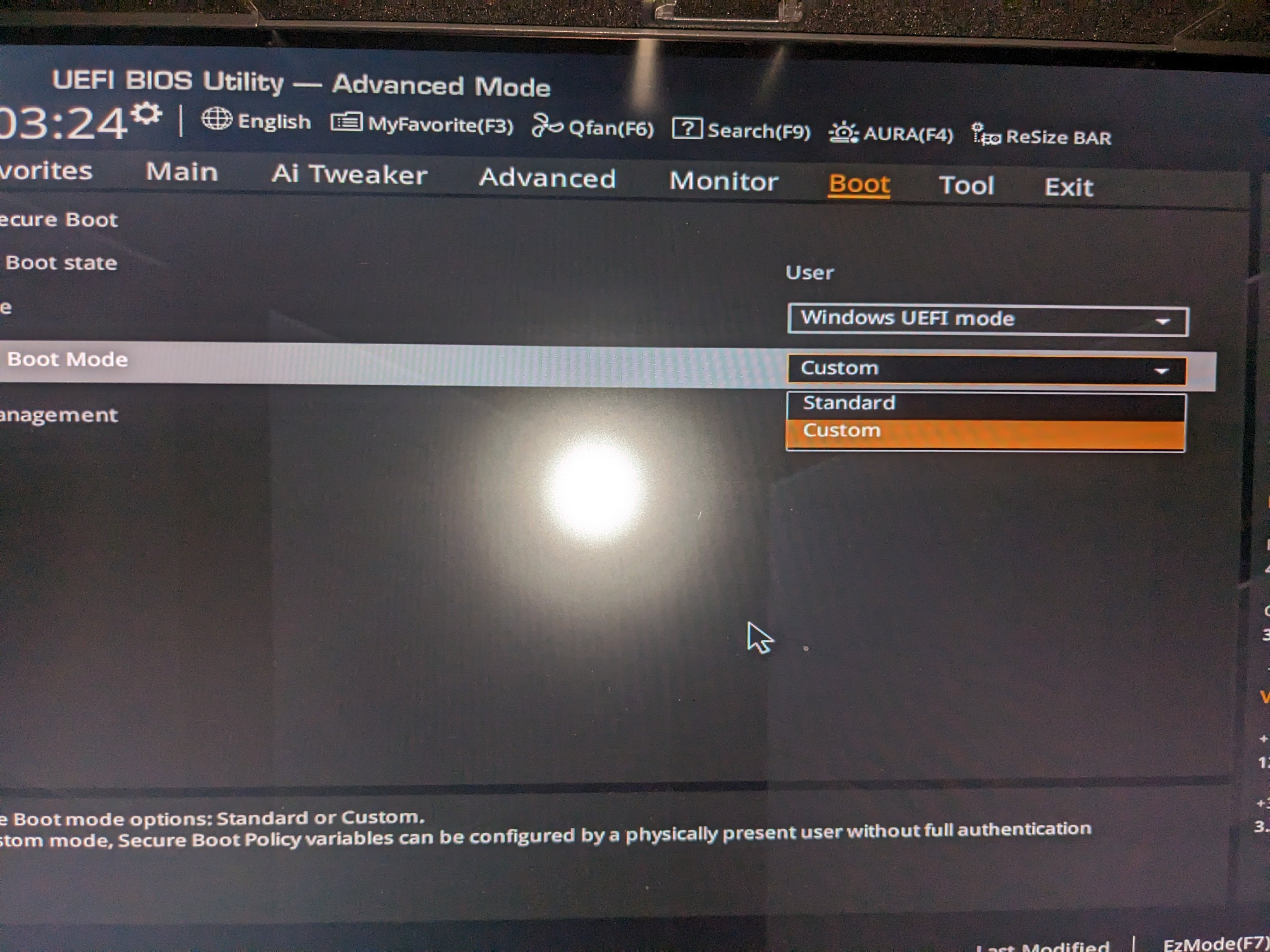Warum ist secure boot "custom"? Mal alle defaults im UEFI laden, CSM aus. Wo hast Du überall dran rumgestellt?