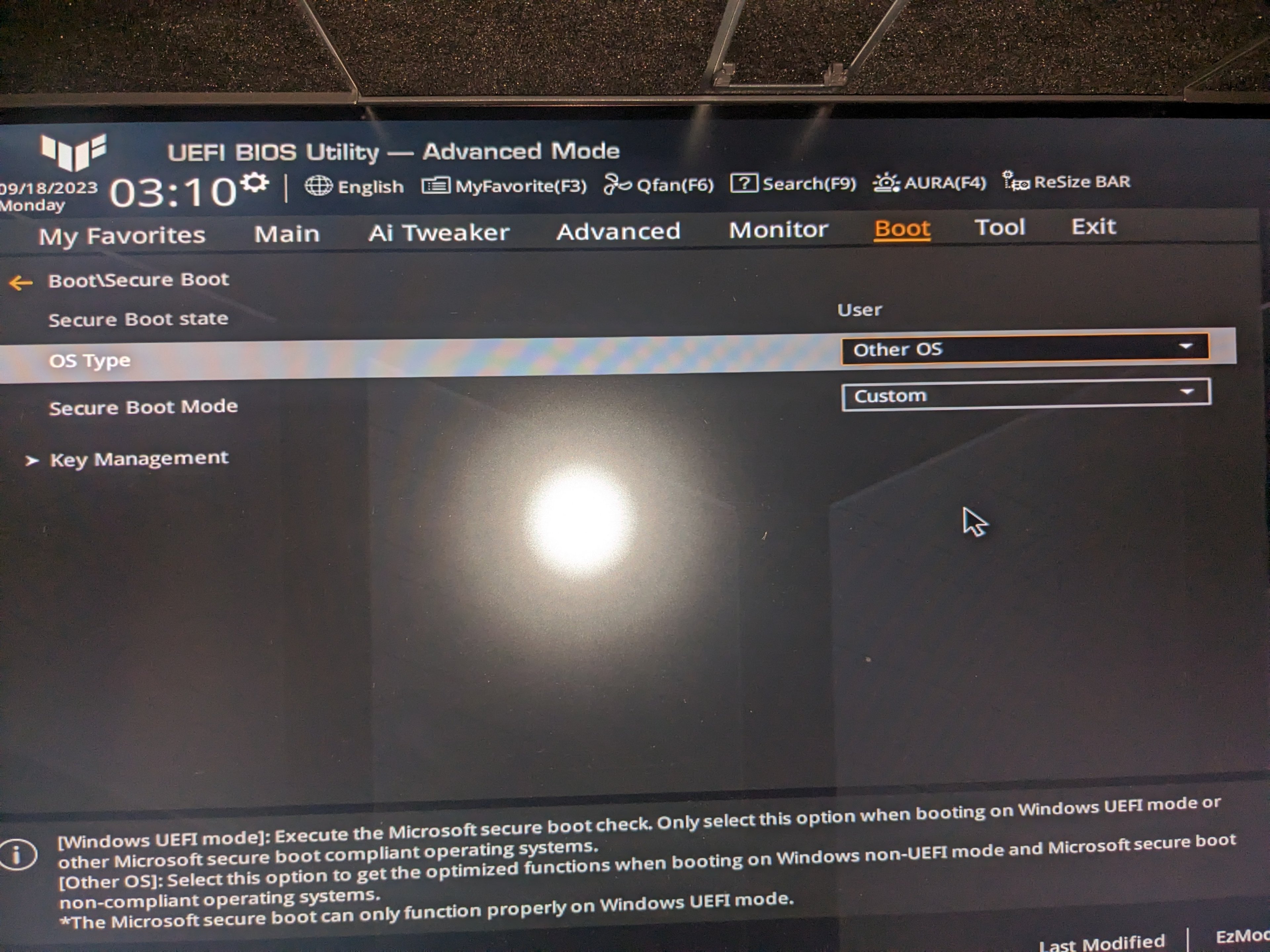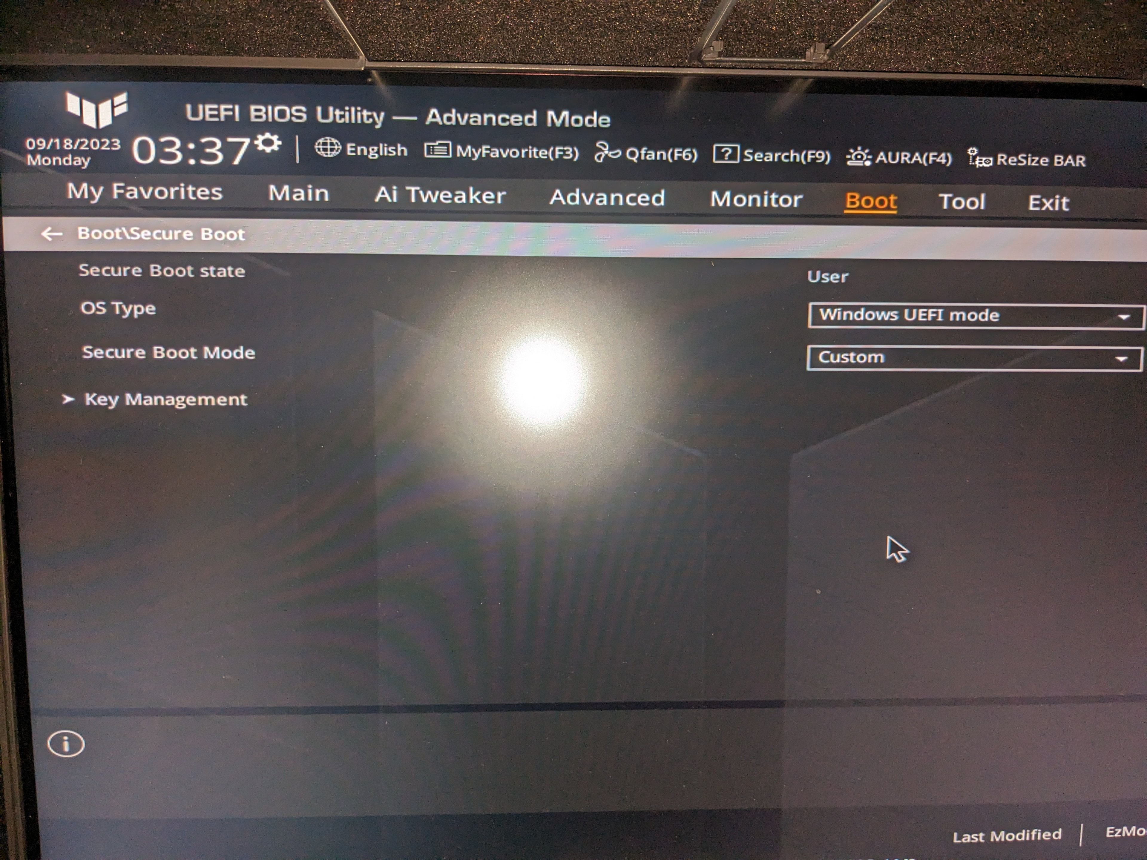 Da müsstest du Windows UEFI mode auswählen und bei Secure Boot Mode müsstest du vermutlich irgendwas mit on aktiviern