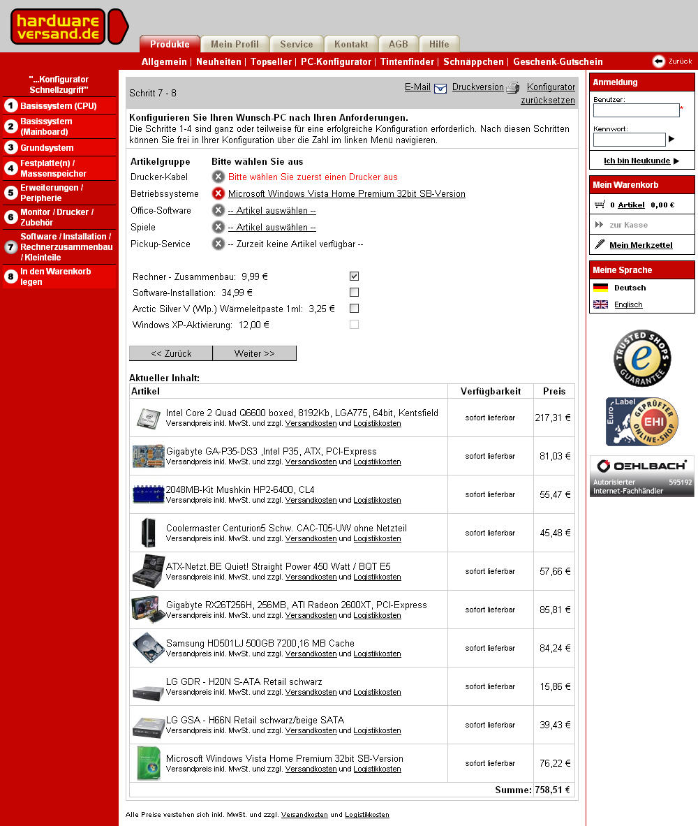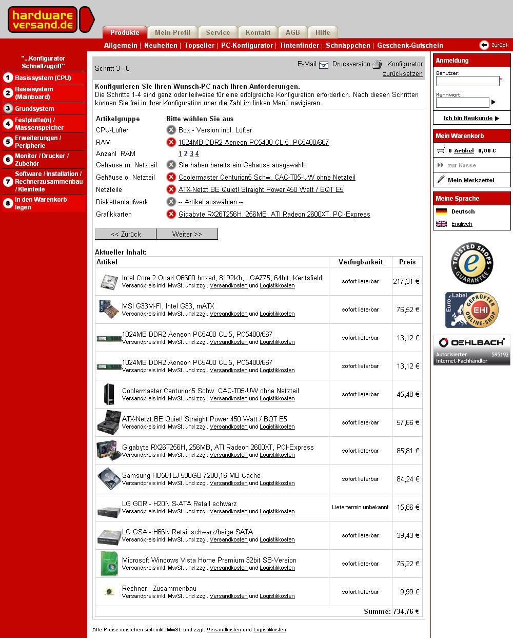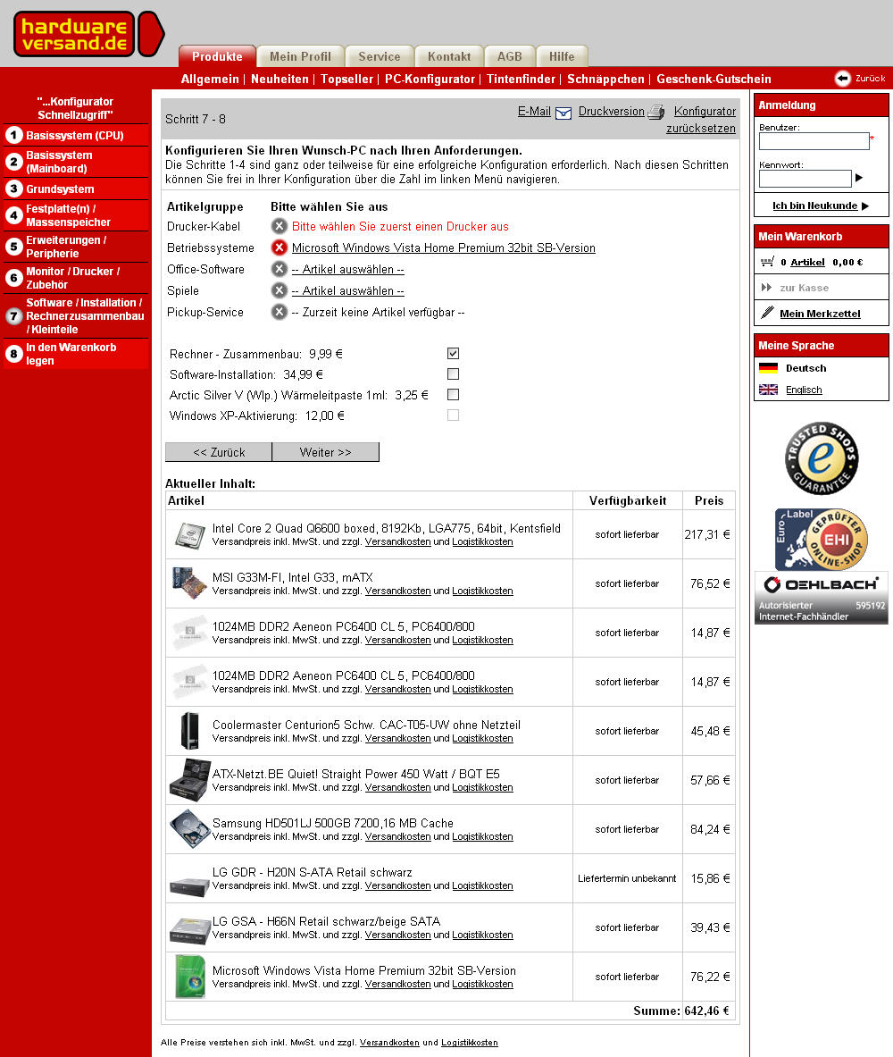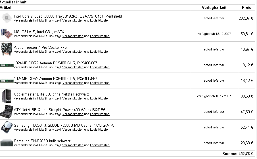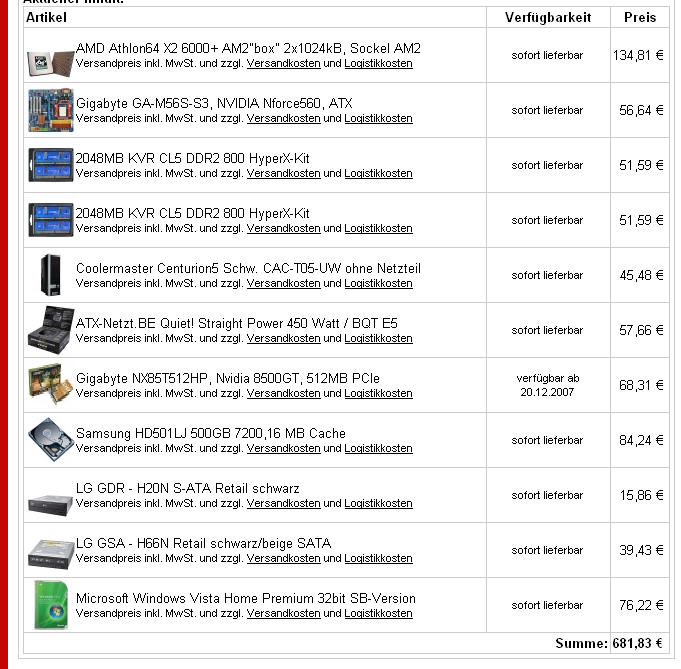 Hallo ! Also,ich hab da ne Zusammenstellung und würde gerne eure Meinung hören.Ich möchte mit dem Pc..Surfen,Office und ab und zu mal Videoschneiden (Pinnacle.Magix) daher auch das Firewire....spielen tu ich eigentlich fast nie......sollte ein paar Jahre reichen und nicht gleich in die Knie gehen wenn mehere Anwendungen laufen.Er sollte ziemlich ruhig sein und so in der Preisklasse liegen.Falls ihr was ändern würdet,bitte nur mit Teilen die bei Hardwareversand erhältlich sind.
