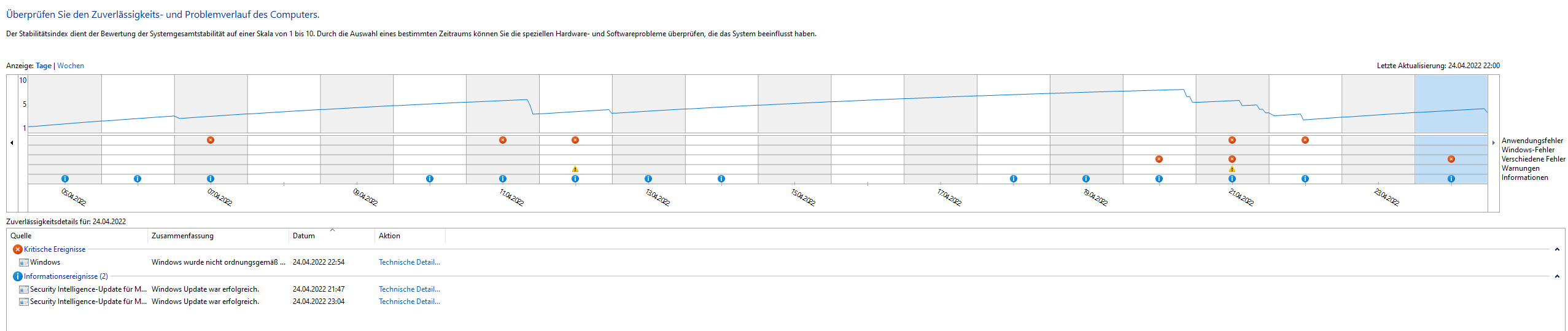 Schau auch mal in den ZuverlĂ€Ăigkeitsverlauf, was es dort interessantes gibt,