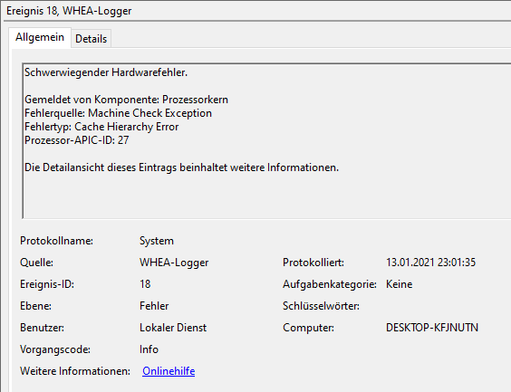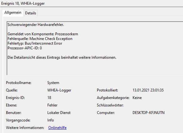Ich habe in unregelmäßigen Abständen Abstürze inkl. Bluescreen mit meinem neuen PC. Dabei ist es egal ob ich einfach auf dem Desktop bin oder etwas spiele. Es handelt sich um den WHEA Logger Error 18 oder auch WHEA_UNCORRECTABLE_ERROR (siehe minidump im Anhang). Im Internet findet man unzählige Beiträge und Anfragen zu der Problematik, leider aber auch viele Lösungsansätze. Z.B.: