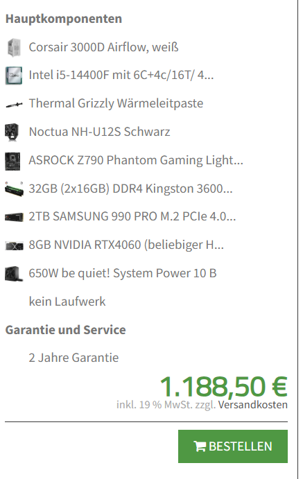 Nur mal so als Vergleich: Wenn du etwas sehr sehr Ă€hnliches (quasi gleich weil 13400f = 14400f, ssd und Netzteil kaum ein Unterscheid) bei Dubaro konfigurierst zahlst du fast 1200âŹ