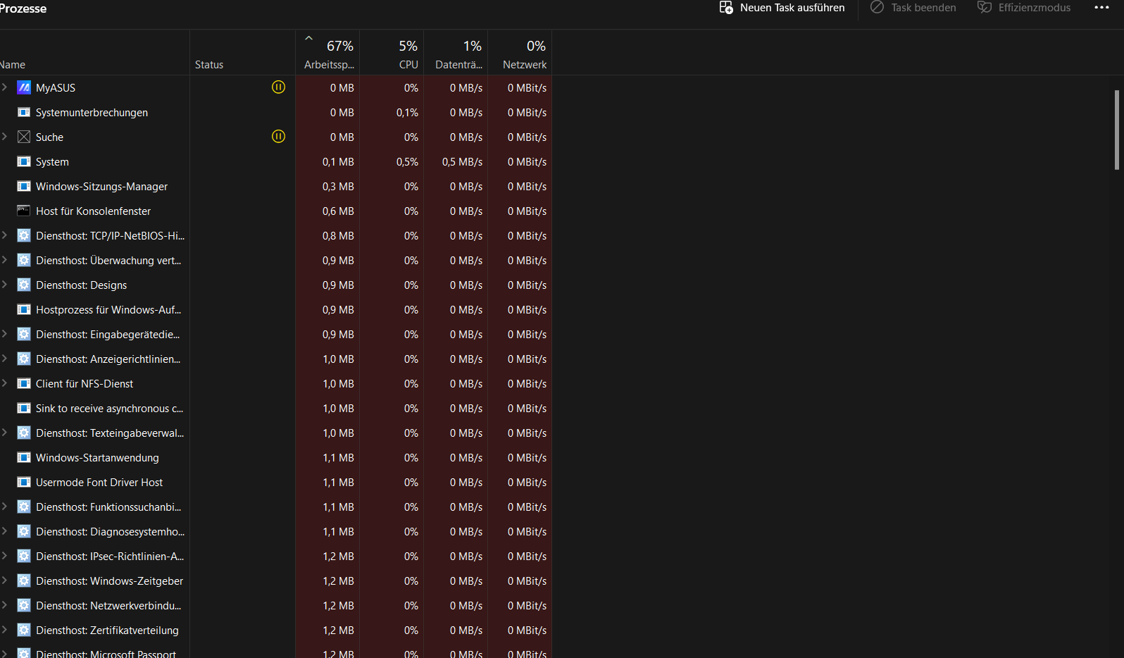 Wieso hast du im TaskManager nach der niedrigsten RAM-Benutzung gefiltert? Das muss genau anders rum sein wenn du wissen willst was am meisten verbrauchrt. Bitte auch noch einen Screenshot von der Seite "Leistung".