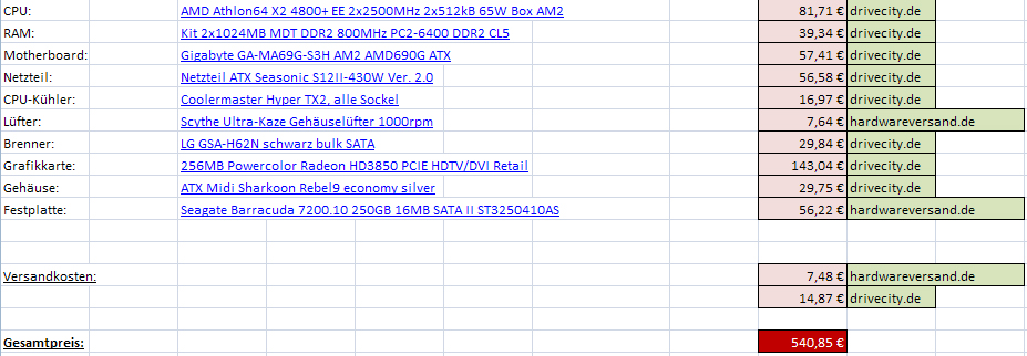 Der Rechner darf bis zu 540€ kosten, also habe ich nach der jetzigen Konfiguration noch etwa 50€ Luft, jedoch weis ich nocht wo ich diese noch investieren könnte.