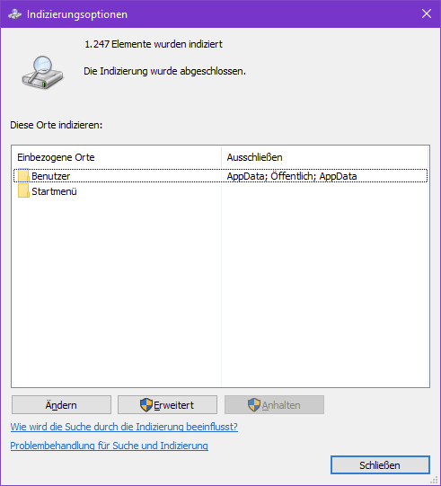 Durch die Indizierung der Inhalte des PCs erhalten Sie schnellere Ergebnisse, wenn Sie nach Dateien und anderen Inhalten suchen. Informationen zur Funktionsweise.