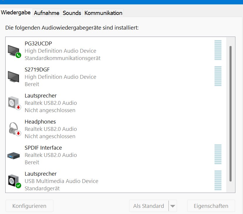 Ähm jetzt bin ich verwirrt, ich hatte den Kopfhörer in richten Klinkenbuchse am PC (bei deakt. Concept, also nicht verbunden mit PC) da hatte ich Sound vom PC im Kopfhörer über Lautsprecher Realtek 2.0 Audio. Dann habe ich die Klinke von der Teufel in die gleiche Buchse am PC gesteckt ohne das USB Kabel der Teufel mit dem PC zu verbinden. kein Ton Wenn ich das USB Kabel der Concept wieder in den PC stecke kommt autmatisch der Soundchip der Teufel zur Aktion und bringt schlechten Sound über die Klinke. Gott was für ein Mist