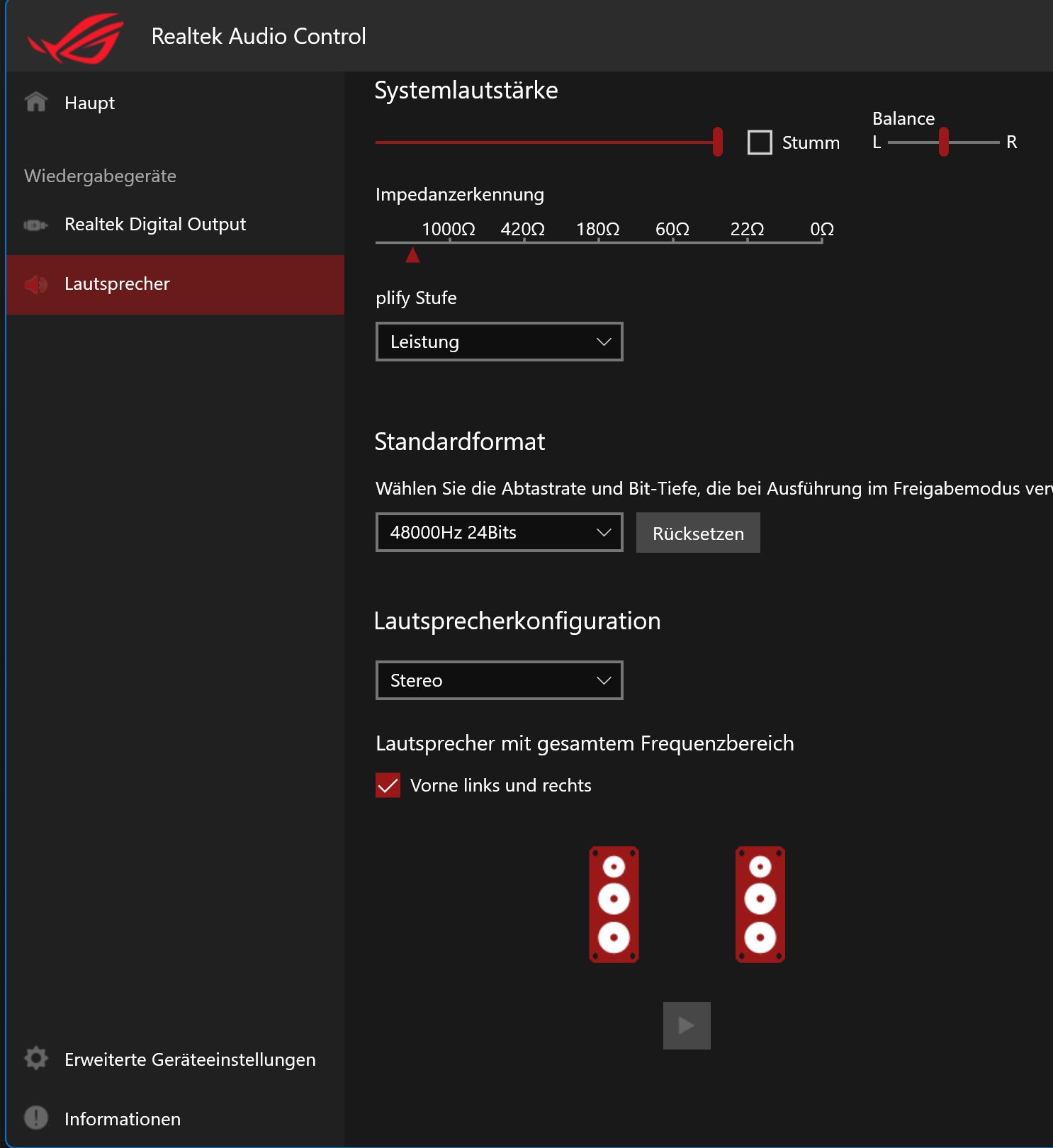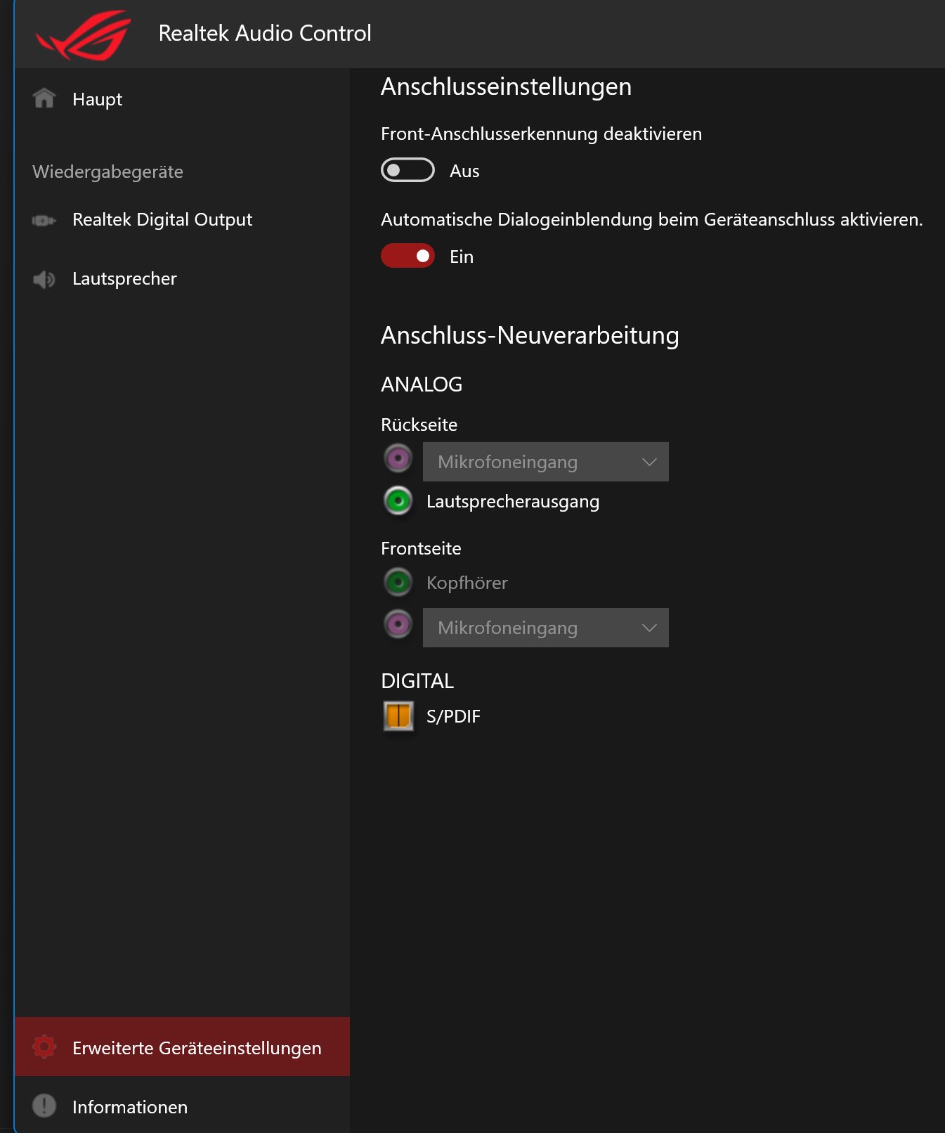 @blondi3480 Vielen Dank für Deine Mühe ich habe mal alles durchprobiert bei mir. Komme zum selben Ergebnis wie die Jungs da im Asus Forum. Habe alles durchprobiert jeden Lautsprecher kein Sound. Als ich die Klinke vom Teufel reinsteckte wurde das in der Realtek Audio Konsole auch angezeigt der Port wurde grün. Eigentlich müsste es funktionieren aber leider geht wirklich nur der Sound vom Chip des Concept C. ich muß auch dem Post im Asus Forum zustimmen it's just that I don't appreciate spending $500 on a motherboard and not having all the features available.