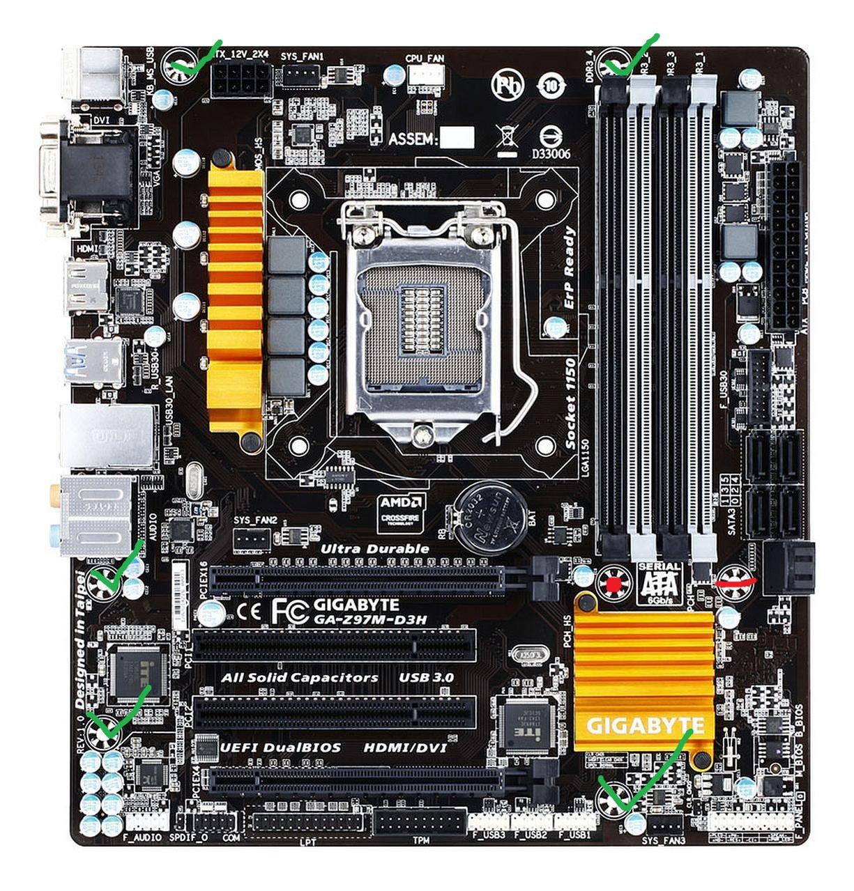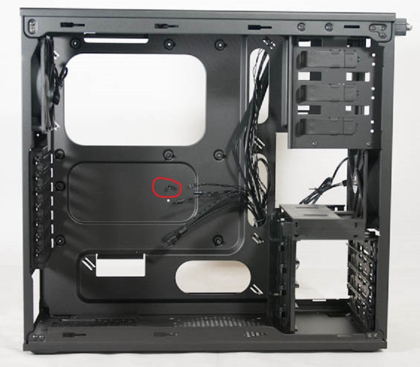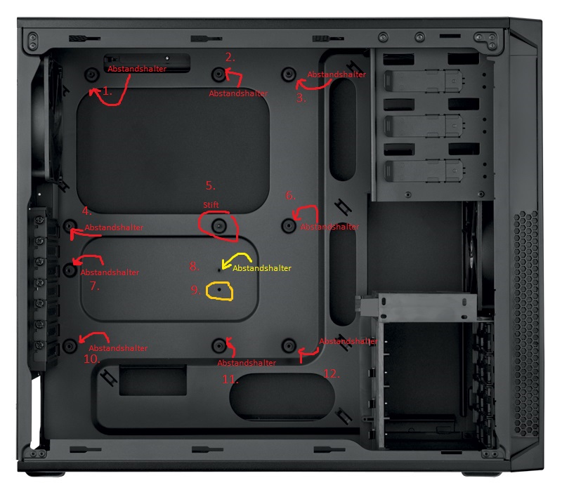 Beim Einbau des Motherboards stutzte ich bereits, als ich sah, dass man von den mittleren 3 Löchern nur die linke Seite fest auf dem Abstandshalter verschrauben konnte. In der Mitte (eher mittig rechts) befindet sich ein Stift, der durch das Loch in der Platine schaut. Rechts fehlt wegen der geringen Maße des MBs die Möglichkeit das Board zu fixieren.