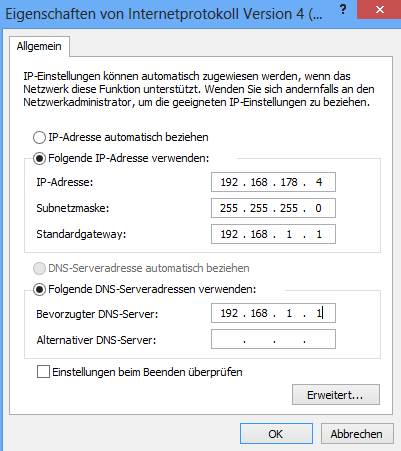 Nun habe ich versucht, meinem PC eine statische IP zuzuweisen: