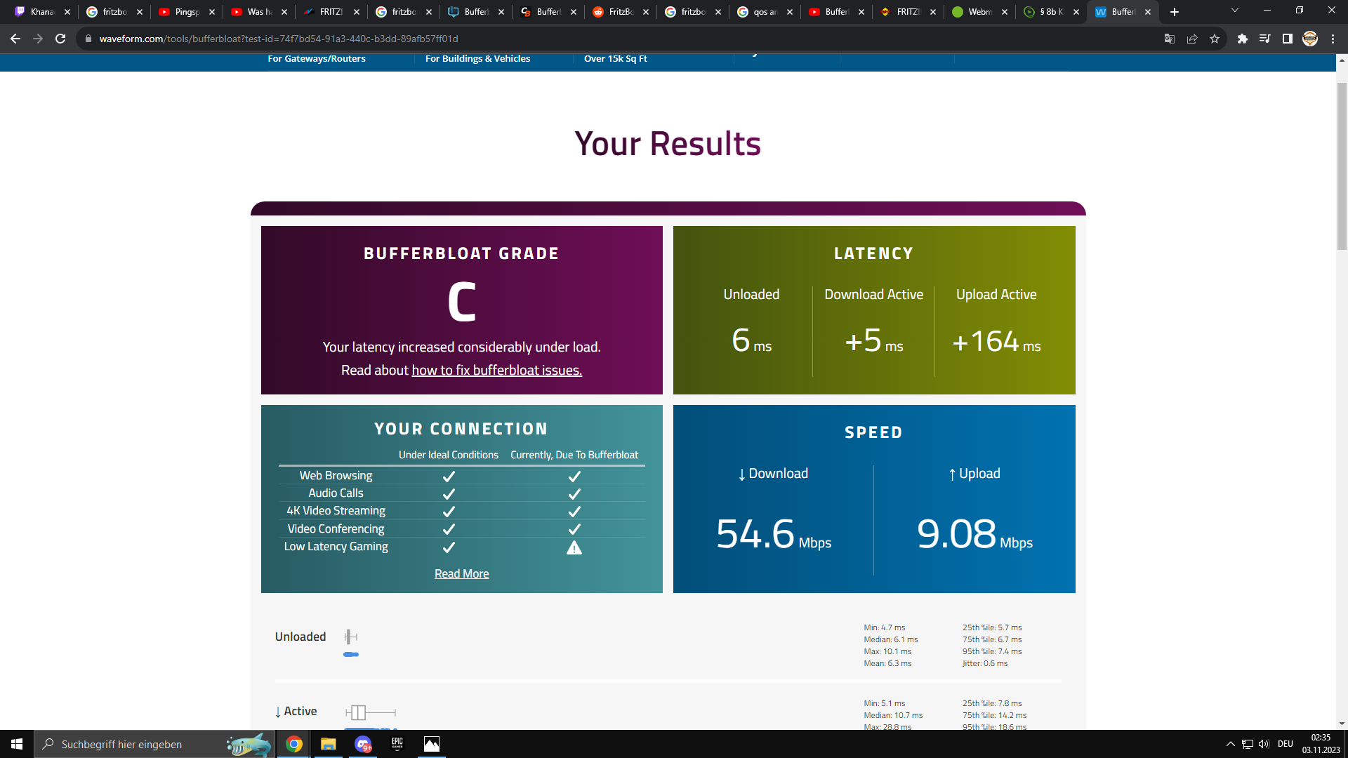 Hab mir nun einen Cudy AC1200 Dualband Gigabit WLAN Mesh Router, 867Mbit/s 5GHz + 300Mbit/s 2,4GHz, 4 Gigabit LAN-Port, VPN, WR1300 router geholt jemand schrieb auf amazon, dass er es damit gefixt hat weil der OpneWRT und QoS funktionen hat. (Die Fritzbox habe ich einfach als IP-Client in deren Menü eingerichtet und mit einem Netzwerkabel von Lan1 an Lan1 angeschlossen. Jetzt telefoniere und faxe (Fritzfax) ich über die Fritzbox und Internet läuft nur über den Cudy.) Das schrieb der nutzer und so wollt ich es auch machen, erstmal muss ich aber ins router menü vom cudy kommen und schauen das ich damit eine Internetverbindung bekomme