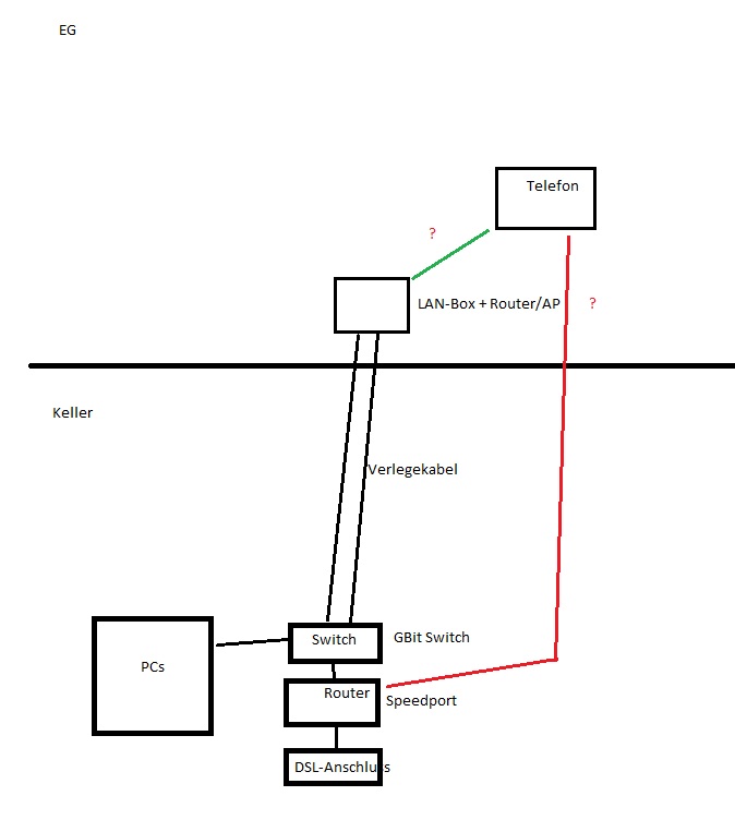 Nun noch folgende Sache: Im EG befinden sich auch unsere Telefone, die aktuell noch mittels einer ANALOGEN Leitung versorgt werden. Da die Telekom uns aber dazu "überredet" alles digital zu betrieben, was wohl in ca. 9 Monaten der Fall sein wird, werden wir auch auf VoIP umstellen müssen. Wie funktioniert das dann mit den Telefonen? Kann ich diese dann einfach an die LAN-Buchsen (bzw. den dort stehenden Router) hängen (grün) und der Router, der im Keller bleiben wird, macht den Rest dann allein, oder muss ein Kabel für die Telefone vom EG in den Keller (rot) gelegt werden?
