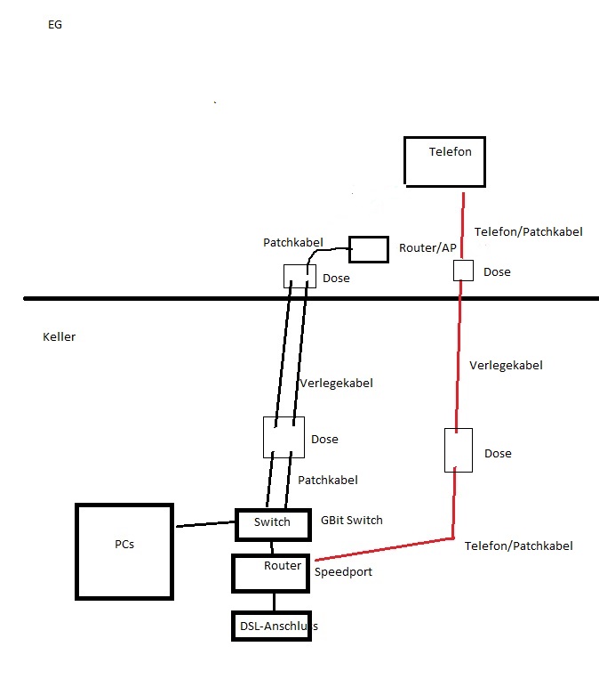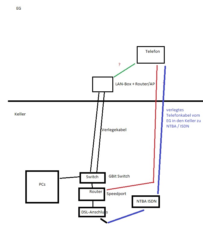 Ich habe gerade mit meinem Vater gesprochen: Also ein Telefonkabel (blau - Boxen habe ich mal ausgespart, aber eine ist neben den Telefonen eine unten neben dem PC) geht bereits vom EG in den Keller, da wir beim Router, das NTBA/ISDN-Zeugs stehen haben. Die Frage ist also: Müssen wir diese Telefonkabel wegen VoIP ersetzen oder können sie bleiben und die ganzen Geräte werden dann einfach in den Router eingesteckt anstatt in die ISDN Anlage?