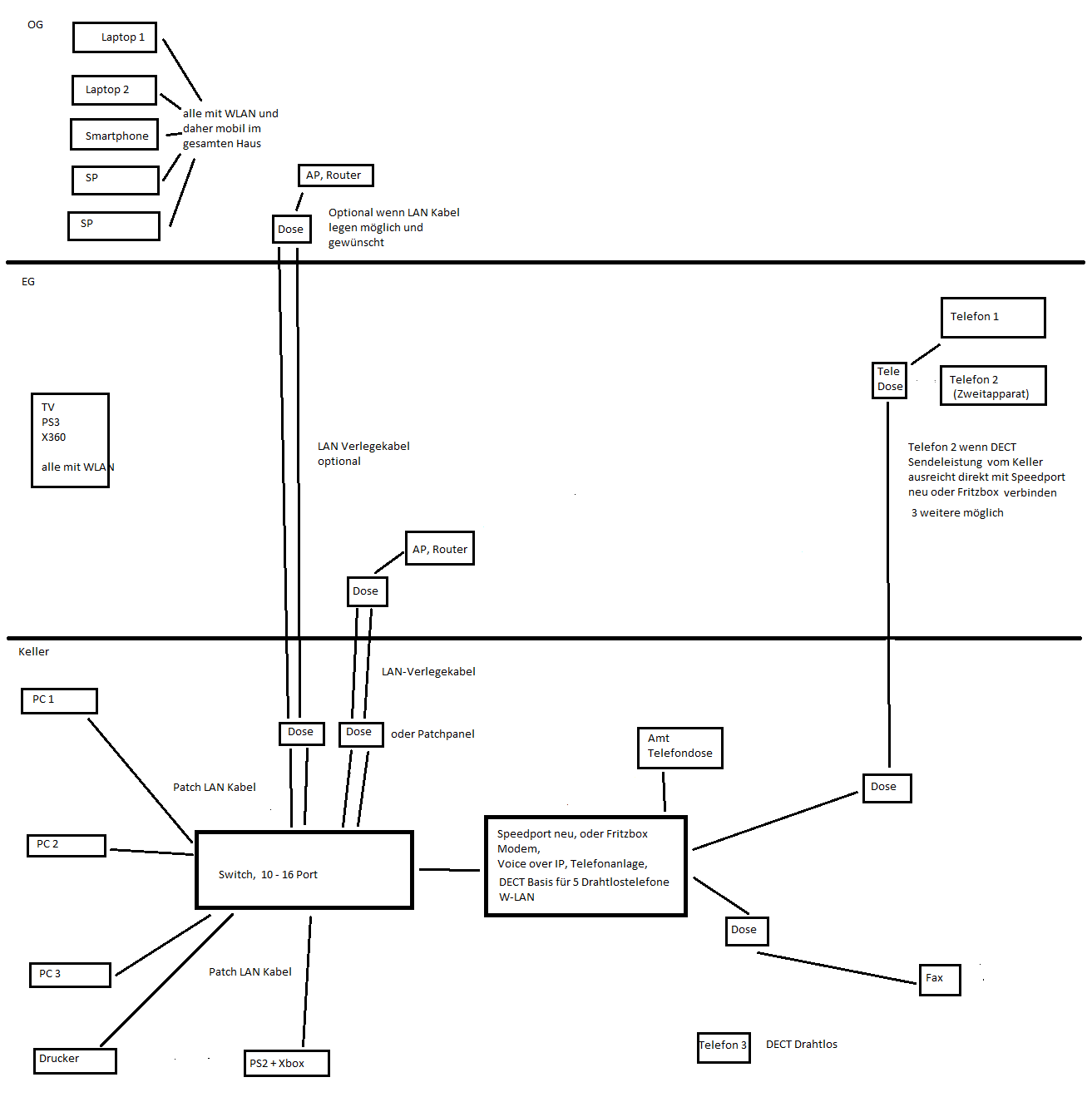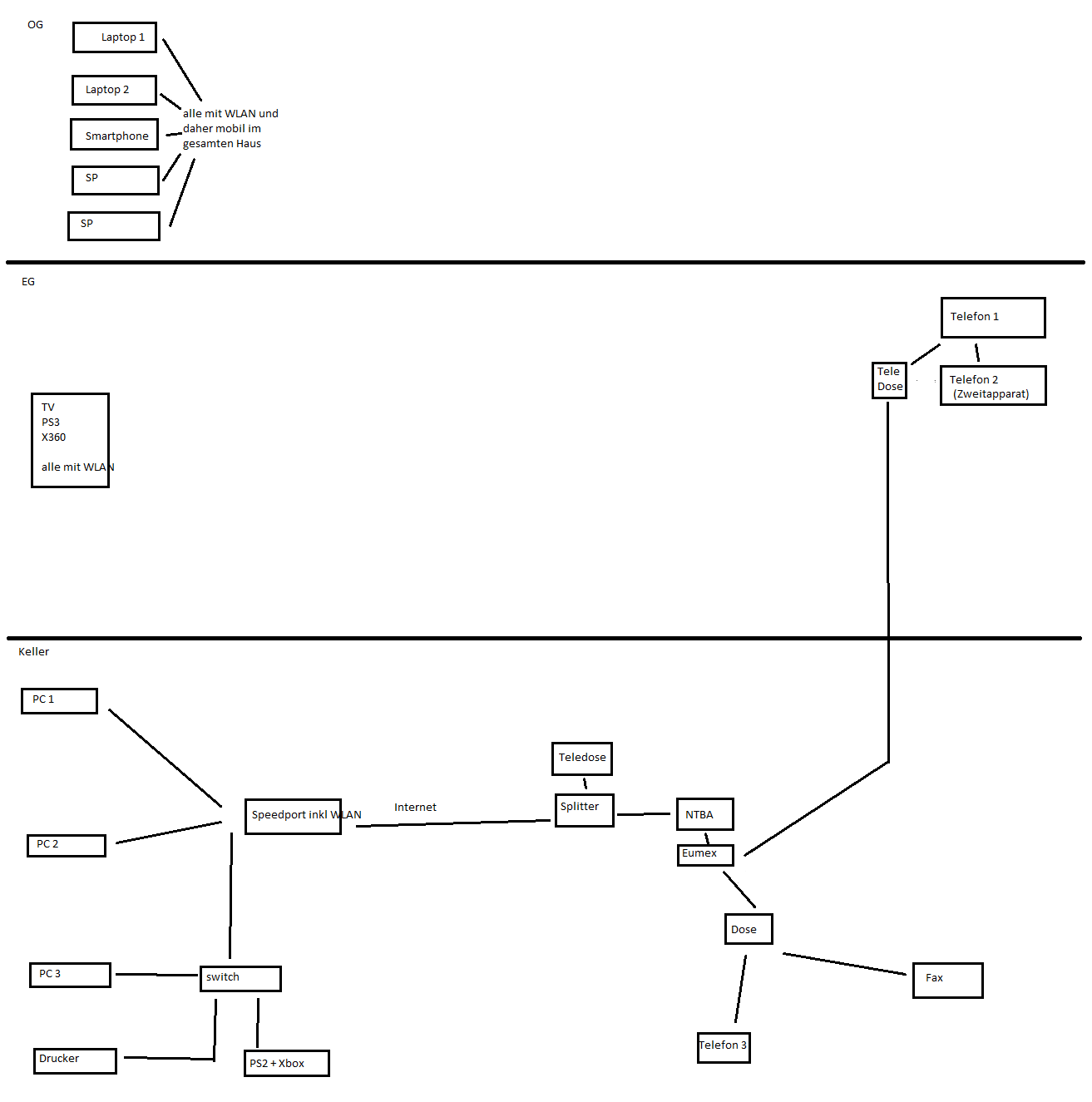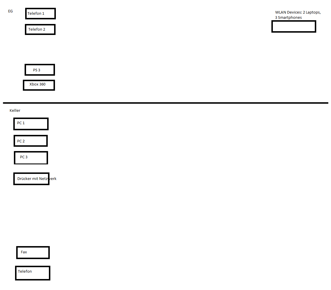 Mach nochmal eine Skizze mit allen Geräten, auch Telefonen in allen Etagen. Alle PCs, Notebooks, Tabletts, Smartfones, Drahtlos-Telefone (Dect), ohne Verbindungen dazwischen, nur alle Gerätebezeichnungen rein schreiben. Ich zeichne die Verbindungen ein. Bischen größer die Skizze.