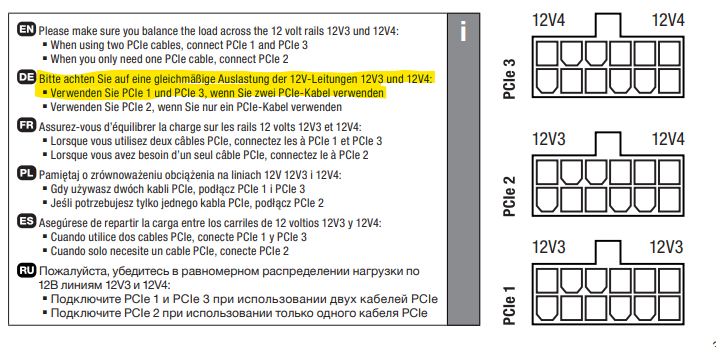Doch, denn vorher war der 2. Kabelstrang durch den Anschluss an PCIe 2 auf V3 und V4, nun aber rein auf V4. Mit der ursprünglichen Verkabelung hast du eben V3 überlastet.